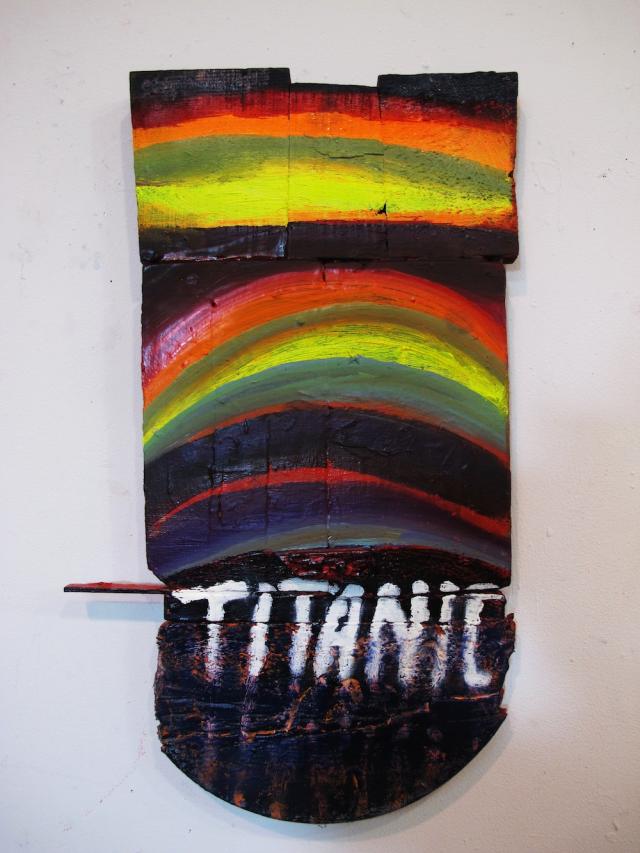 The Arts and Leisure project space in East Harlem is currently presenting a collection of works by Katherine Bradford for the exhibition Shelf Paintings. For this show, Bradford offers several paintings made from materials such as acrylics, cardboard, wood, clay, and paper mache. With this particular series of paintings, she integrates the styles of artists Philip Guston, Howard Hodgkin, and Malcolm Morley and she nicely blends hot and cool colors together. In one piece called Phoenix, Bradford captures the warmth of the sunshine by using colors that such as pink which smoothly turns to orange which then turns to yellow. The light shines upon a curved structure resembling a mountain with several multi-colored round objects, including one pink one sitting on top of a cylinder.