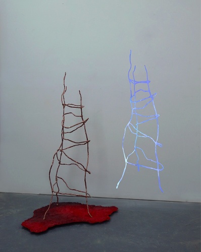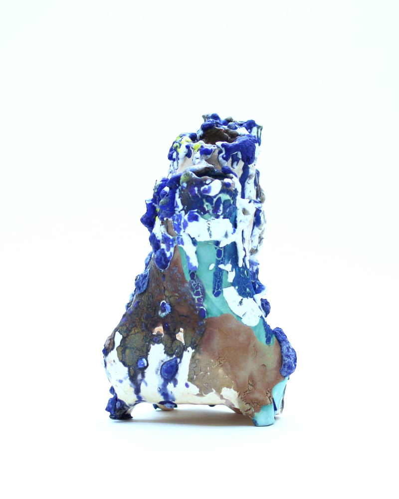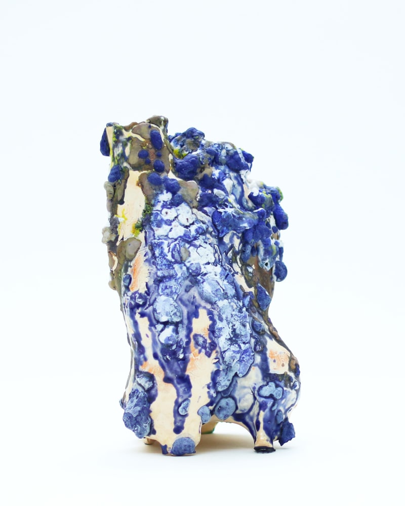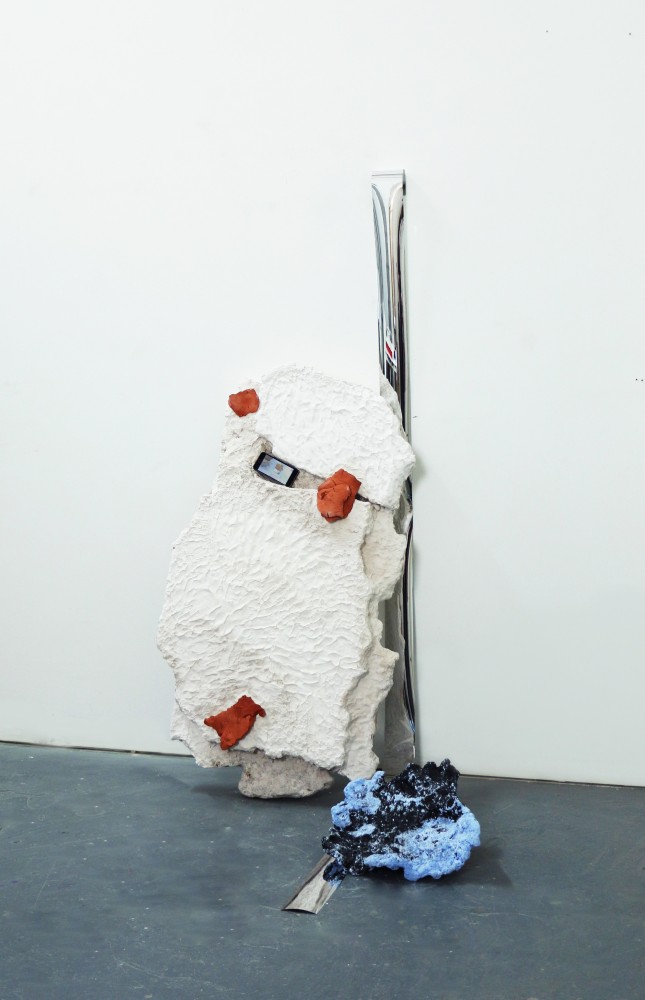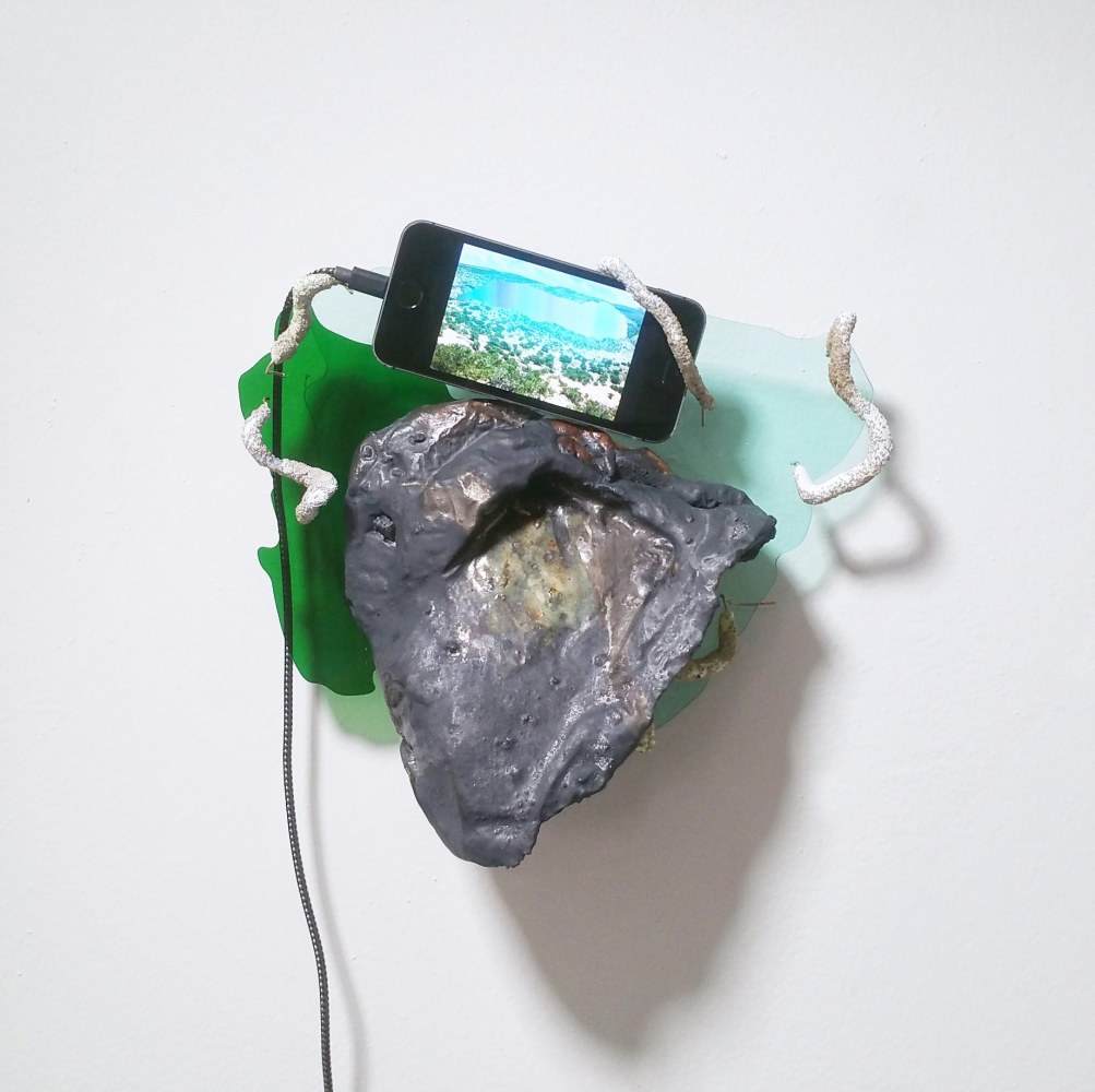 The Other pairs a clay ladder with a projection of the same object, further commenting on the liminal state that exists in the overlap of the real and the digital. The projection surges and pulses, contrasting with the solidity of the clay form, calling attention to the constant flux that underscores the relationship of the two spheres. Infinite Imprint, another work featuring an iPhone, lies firmly in this ambiguous space. Nestled amongst amorphous sculptural objects, constructed with both natural and synthetic materials, the role of the technological device is obfuscated, instead integrated into a unified melange of materials and origins.