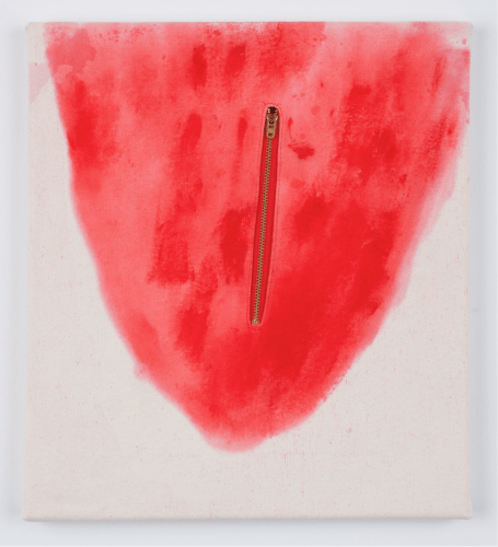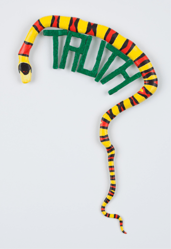 I Want to Break Free operates as a kind of affirmation anthem. It’s the mood conveyed in Strawberry, a fruity stained tongue on raw canvas or in Truth, a sculpted yellow, red and black-banded snake. Zipped tongue and slippery snake belie a desire for openness and communication. These works reflect a broad range of influence—Ferlito rummages through popular culture, music and craft traditions—and in combining materials and styles, she accesses new truths and freedoms.