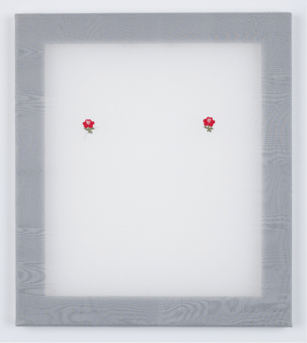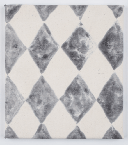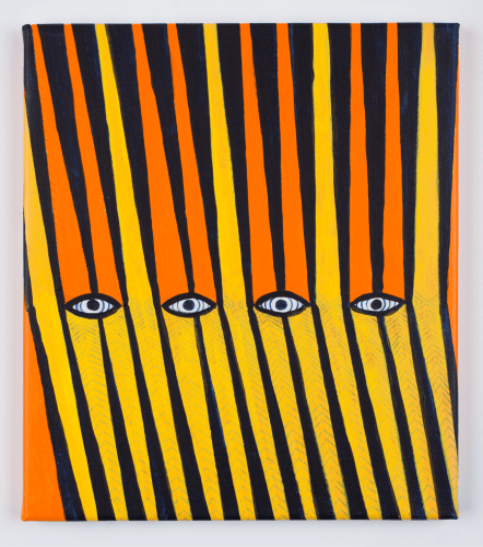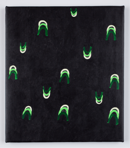Synthesizing thoughts and feelings with imagery is a way to slow the spinning of wheels. Eva, a brushy black field with disappearing glowing green arches, is a pattern from a dress given to her by an elusive hard crush and an opportunity for Ferlito to reflect on relationship dynamics and the nature of love. Taking patterns and details from fabric and costumes of friends, family, fictional characters and performers, Ferlito develops a new visual language that’s underpinned by personal, yet open, narratives.