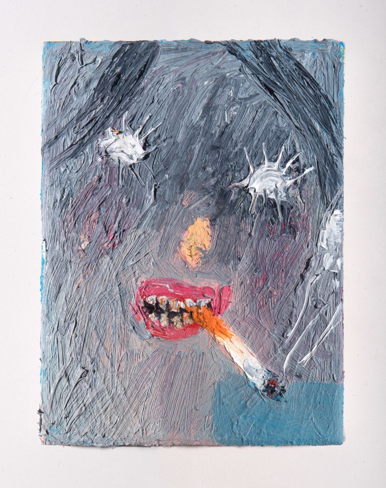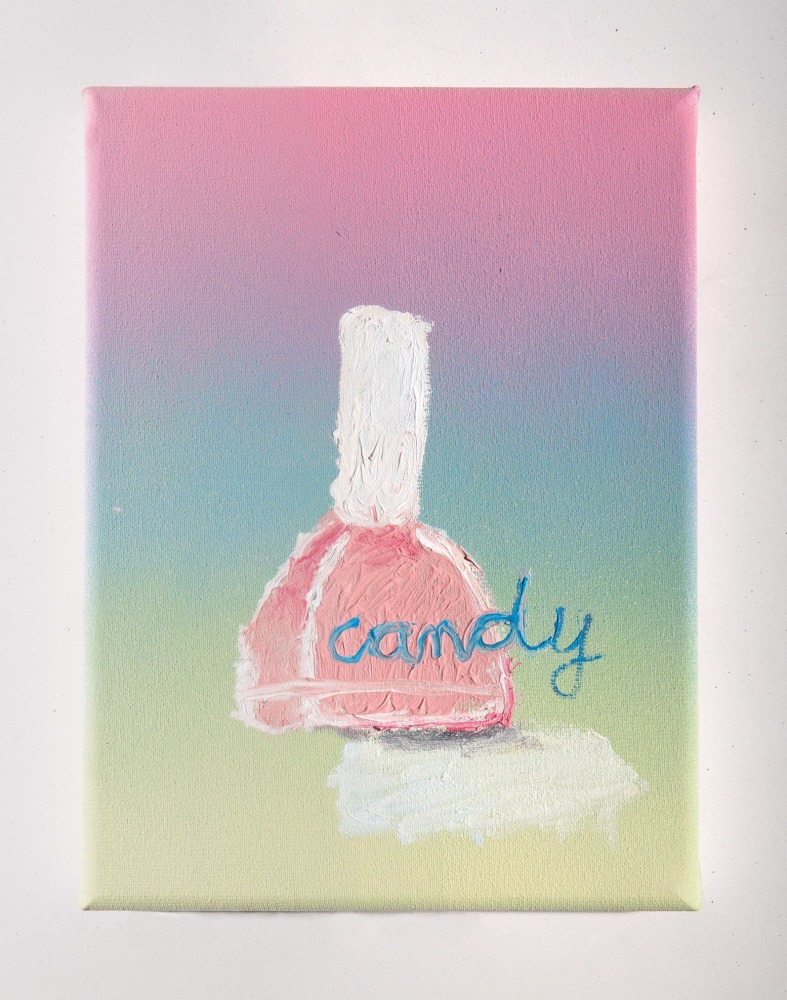 Working with a palette of pastel hues offset by heavy grays and blacks, Fullana’s colors provide something of a physical analogy of the themes present in her work. Likewise, her brushwork, ranging from thick impasto passages to washes of spray paint, leaves an impression of indeterminacy, suggesting a nebulous, hazy dreamscape between reality and fantasy. In “Marlboro Pink,” a pack of Marlboro cigarettes is depicted with its signature red replaced with pink; here, a loaded symbol of a sort of kitchen-sink reality is given a whimsical makeover, though the effect is rather unsettling and provocative. The contrast between the reality of the subject and its naive, childlike portrayal blurs the line between the innocence of childhood and the stark realities of adulthood.