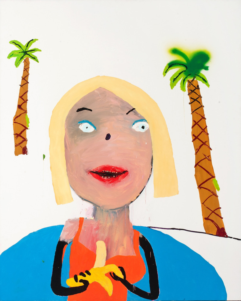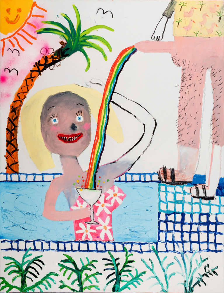 Similar themes of transgression and abjection appear throughout the other works in the exhibition. In “Mamading in the Swimming Pool,” perhaps the most troubling work in the show, Fullana presents a scene of sexual depravity with undertones of coercion in her characteristic style. Referencing “mamading,” an infamous phenomenon among vacationing Brits in the resort town of Magaluf, in which women are encouraged to provide sexual favors in return for free alcohol, the artist masks the cruelness of the situation with a bright aesthetic veil; the woman is smiling, as is the sun, and a rainbow streams into her glass from the penis of the man standing above her. However, closer examination suggests an altogether different image, one in which degradation and humiliation exist within a framework of tacit cultural acceptance and privilege. The woman’s wide eyes and toothy smile belies an expression of stupor and drunkenness, and the faceless man stands as a totem of systematic exploitation. Nonetheless, Fullana’s visual approach complicates a decisive reading of the painting, compelling the viewer to formulate their own understanding of the work’s conflicting impulses.