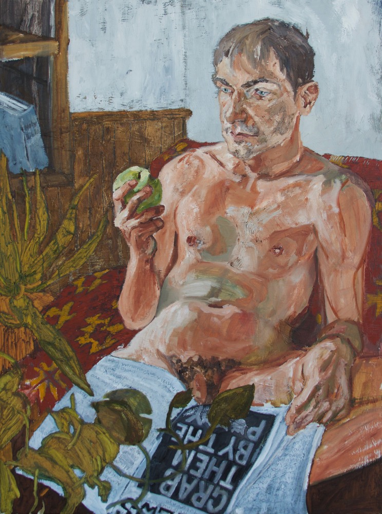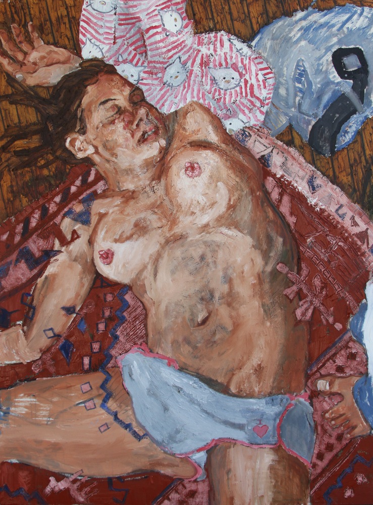 Much of Despujols’ work focuses on the intersection of perceptions of women by themselves and society, as well as the changing nature of sex and intimacy in contemporary life. In her own words, she queries “how a woman, by virtue of being a woman, makes others uncomfortable”; in Mamita, she transforms female nudity into a sort of declaration of femininity and womanhood, underscored by her unabashed displays of genitalia and sexuality. In Nude 4, the locus shifts from the female presence to the palpably uncomfortable relationship of the anonymous male and female figures. Sharing a half-hearted embrace, the far older man leers at the female subject, whose face bears a mix of apathy and disgust; meanwhile, a tattoo of a dolphin on her lower belly lends cynical undertones, forcing the viewer to question the character of intimacy and sex, as well as the existence of one without the other and its transactional elements.