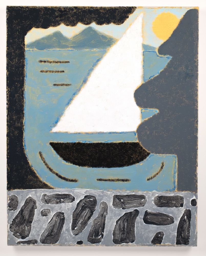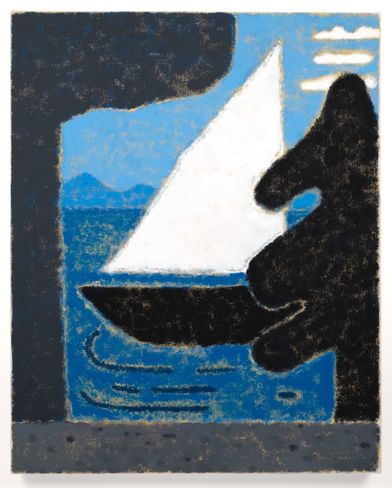 At once weathered and “hand-made”, with several pieces bearing the appearance of aged prints, the works in Home & Garden nonetheless bear a marked softness. In Dockers and For Robert, forms reduced to their simplest geometric foundations maintain a certain fuzziness, as if delineated with a finger rather than a brush. Straight lines seldom appear in Campbell’s work, lending paintings like Mid Summer a hazy, undulating quality accented by his translucent application of paint.
