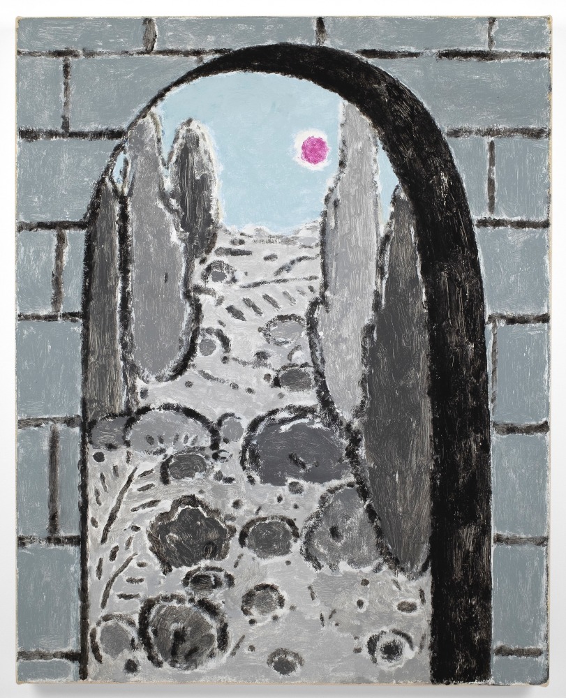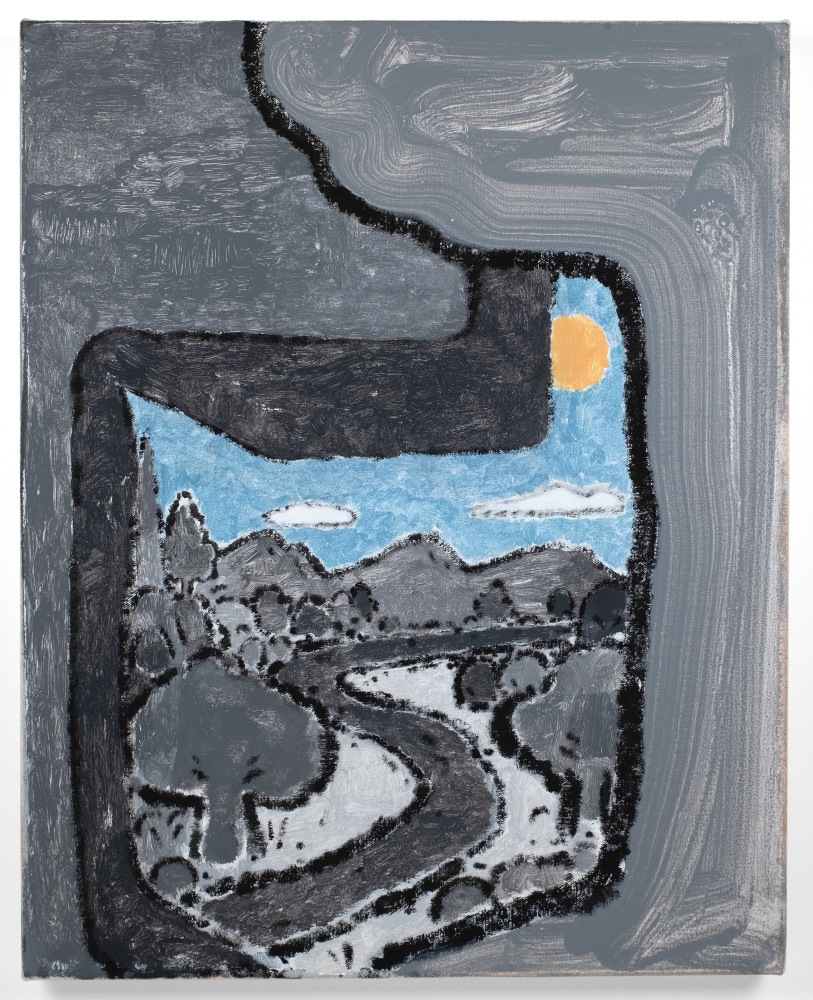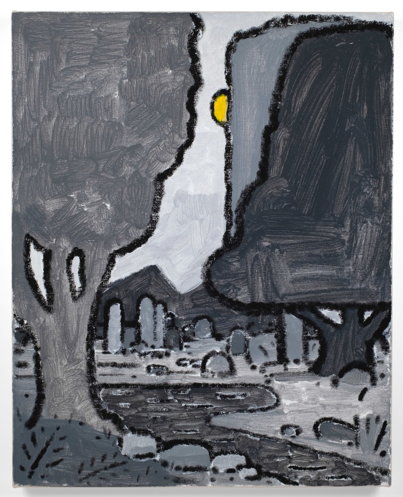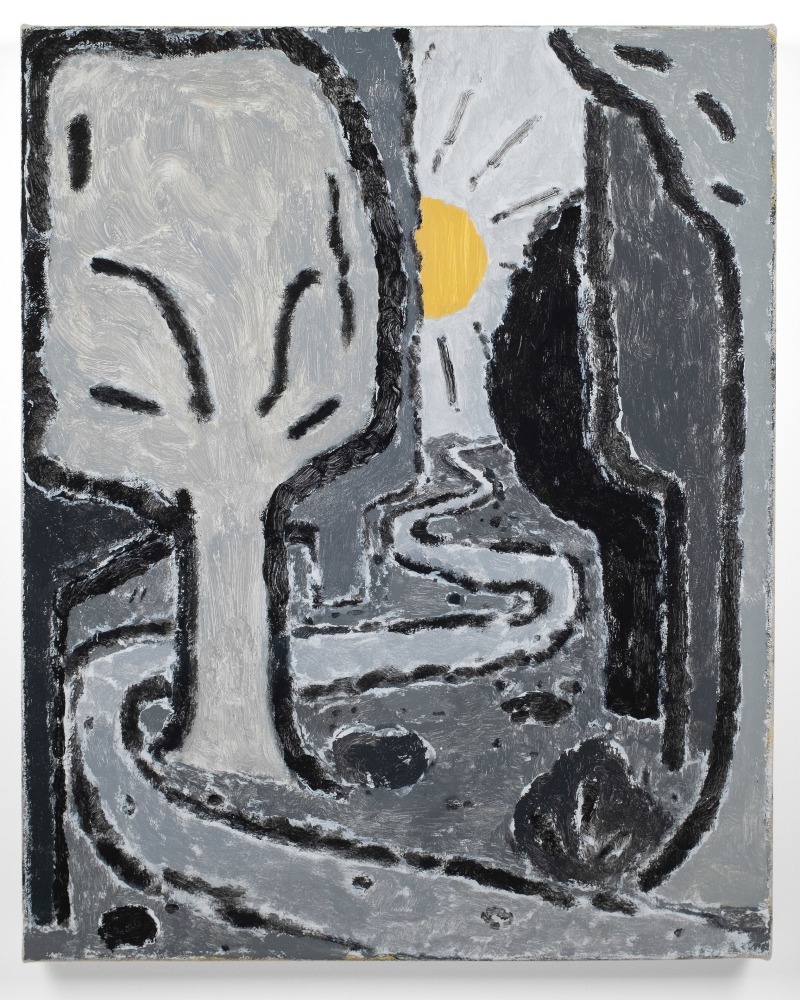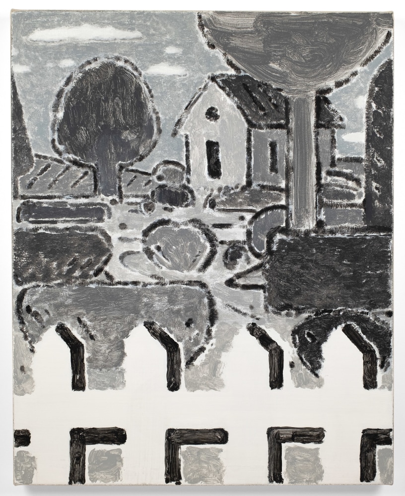 As if hovering just beyond our grasp, the paintings in Home & Garden are enigmatic and nebulous, with their flat planes and thickly outlined objects suggestive of a secret ulterior meaning. Though lacking their nervous energy and horror vacui, or avoidance of empty spaces, Campbell’s paintings evoke both Outsider art, as well as referencing the grainy, roughly drawn work of Jean Dubuffet. In a collection of drawings exhibited along with the paintings, quick, energetic lines mark trees, homes, and other elements, offering a glimpse of the paintings stripped of their painterly heft. Set against the light, sparse drawings, Campbell’s extraordinary ability to conjure impressions of volume and weight is amplified, and it is indeed this duality of form and formlessness that is the crux of Home & Garden.