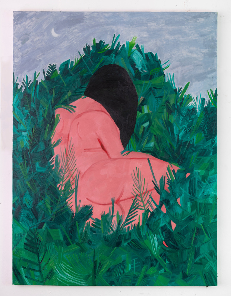 Sheathed beneath a lattice of flowers, the female figures in Field Day and Sorrow Is Not My Name (After Ross Gay) project a sense of reverence and tranquility, a sort of eternal quietude. Recalling Ana Mendieta’s seminal Siluetas series of photographs and performances, Olsen’s figures appear to sink gently into the earth, intimately in tune with nature’s pulse. Though the corpse-like placement of the bodies in these canvases immediately evokes death, Olsen renders them in a state of sublime peace, implying instead a serene return to natural cycles of life and death. Lady of the Dunes captures a figure in a moment of quiet repose, reclining amidst a lush sea of shrubs and leaves. In Marigolds, Olsen again juxtaposes floral motifs with allusions to death, portraying a skull flanked by the eponymous marigolds; however, the skull is grinning, and its form is reminiscent of the sugar skulls used in Mexican Day of the Dead celebrations, highlighting the universal, inevitable nature of death.
