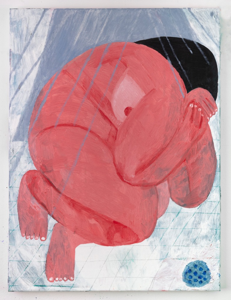 In Medusa and The Gorgon, Olsen probes the symbol of the snake, particularly its association with women. Referencing the demonic female goddesses of Greek mythology, in the former she replaces the figure’s head with a writhing nest of snakes; interestingly, the figure’s back is turned to the viewer, thus negating Medusa’s supposed ability to turn those who gaze at her face into stone. The composition of The Gorgon is quite similar to Olsen’s paintings of female figures beneath layers flowers, though here they are replaced with sensuously curved, interweaved snakes. Adopting a domestic setting, End of Day captures a moment of supreme vulnerability and helplessness; curled in the fetal position on the floor of a shower, the female subject appears overwhelmed and immobile, a far cry from Olsen’s floral pieces. Similarly, in Mornings and Night Stretch, the artist explores the potential of the body as a site for physical manifestations of emotion, tucking psychological tones of depression and apathy within the creases of skin.