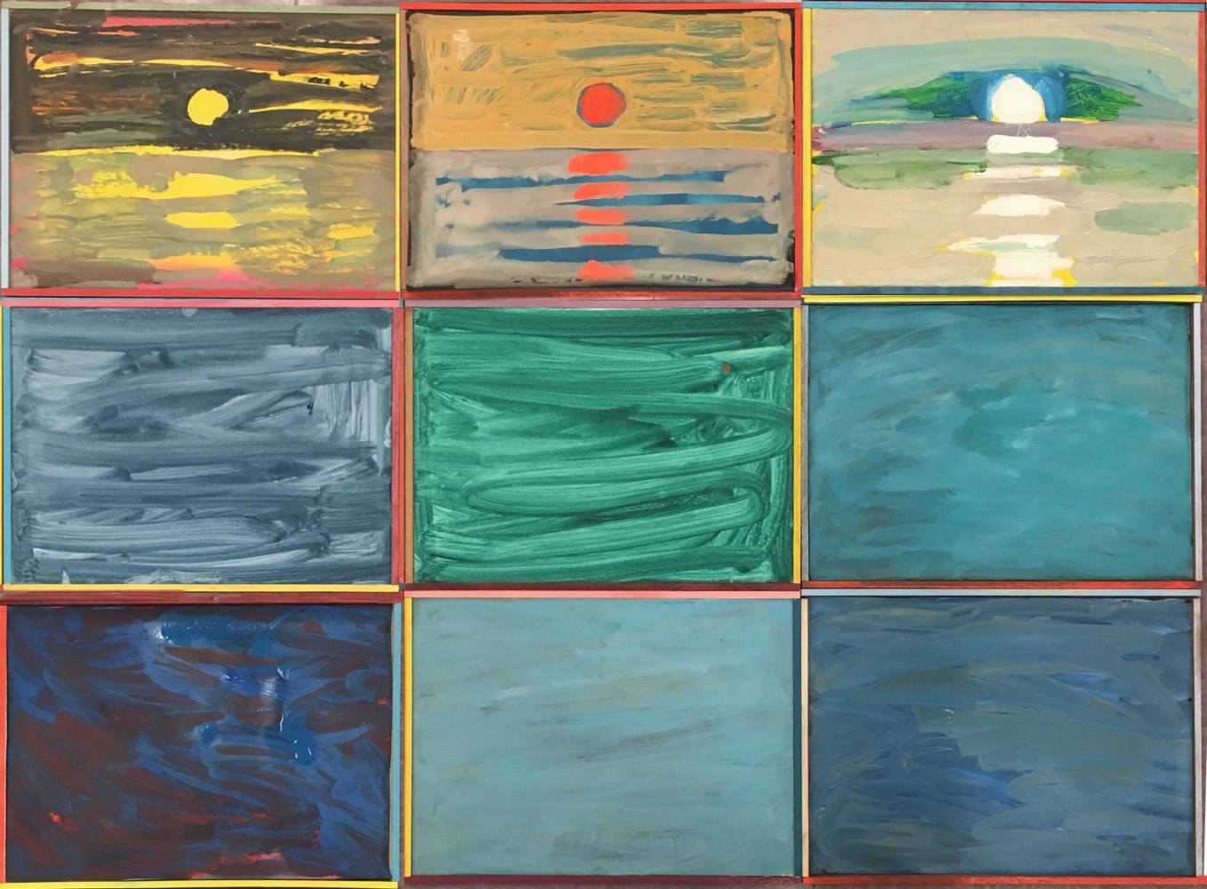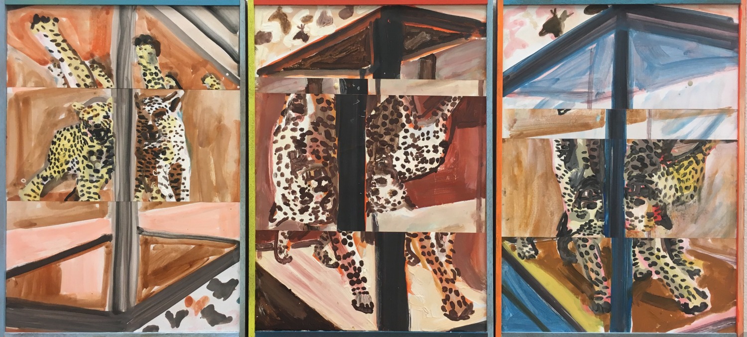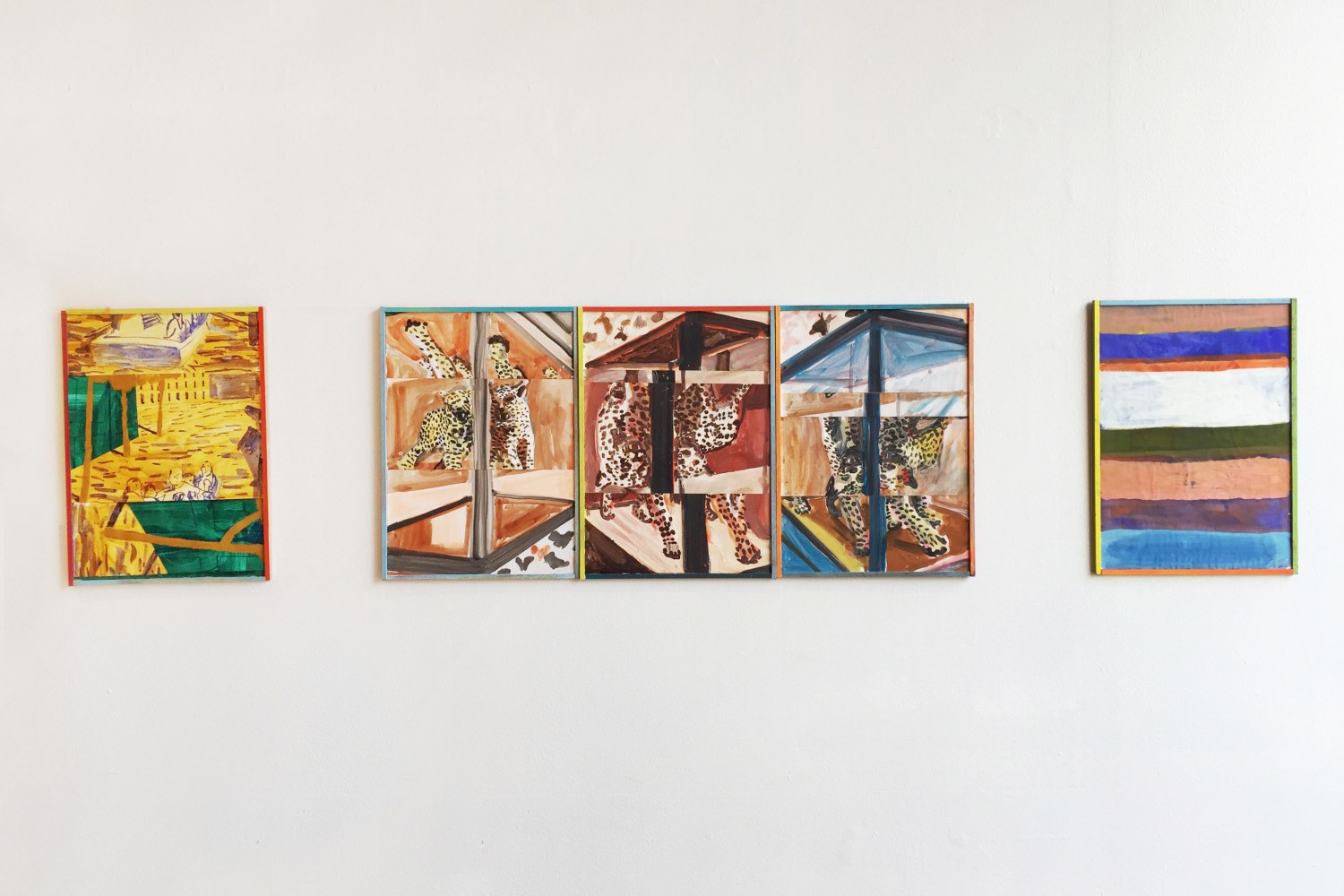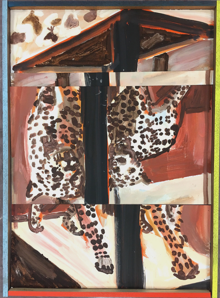 In addition to the video are combinations of small paintings in multi-colored frames, organized tightly in a grid that alludes to a sequence of video. Some depict the sentimental subject of the sun setting over a horizon of a sloppily painted field of color which might double as waves in the sea. Elsewhere, a triptych called Musée de la Chasse depicts a hunting trophy display of two cheetahs, deconstructed. Though the subject matter of these paintings is diverse, they are connected to each other through their concern with scale, pattern and framing.