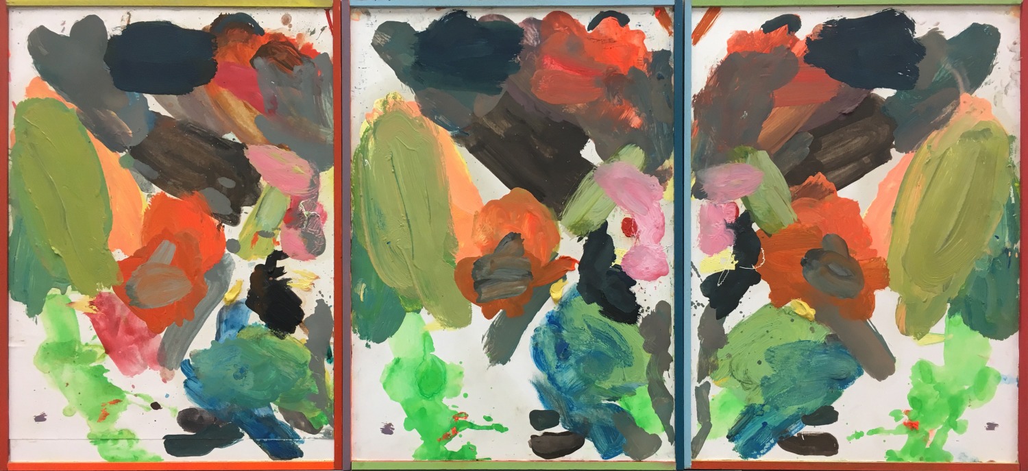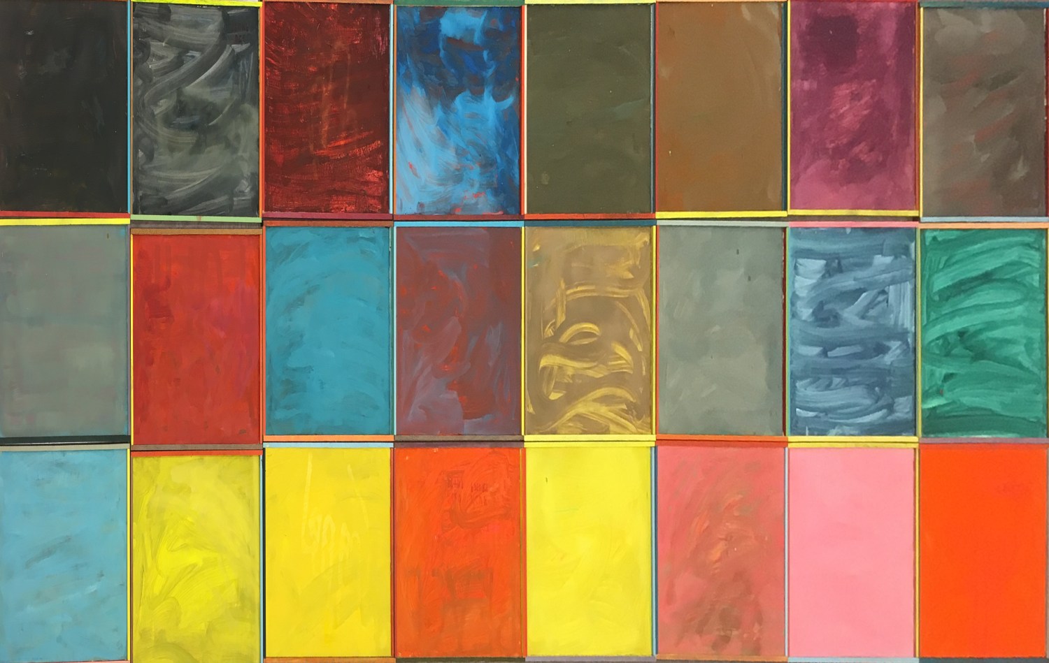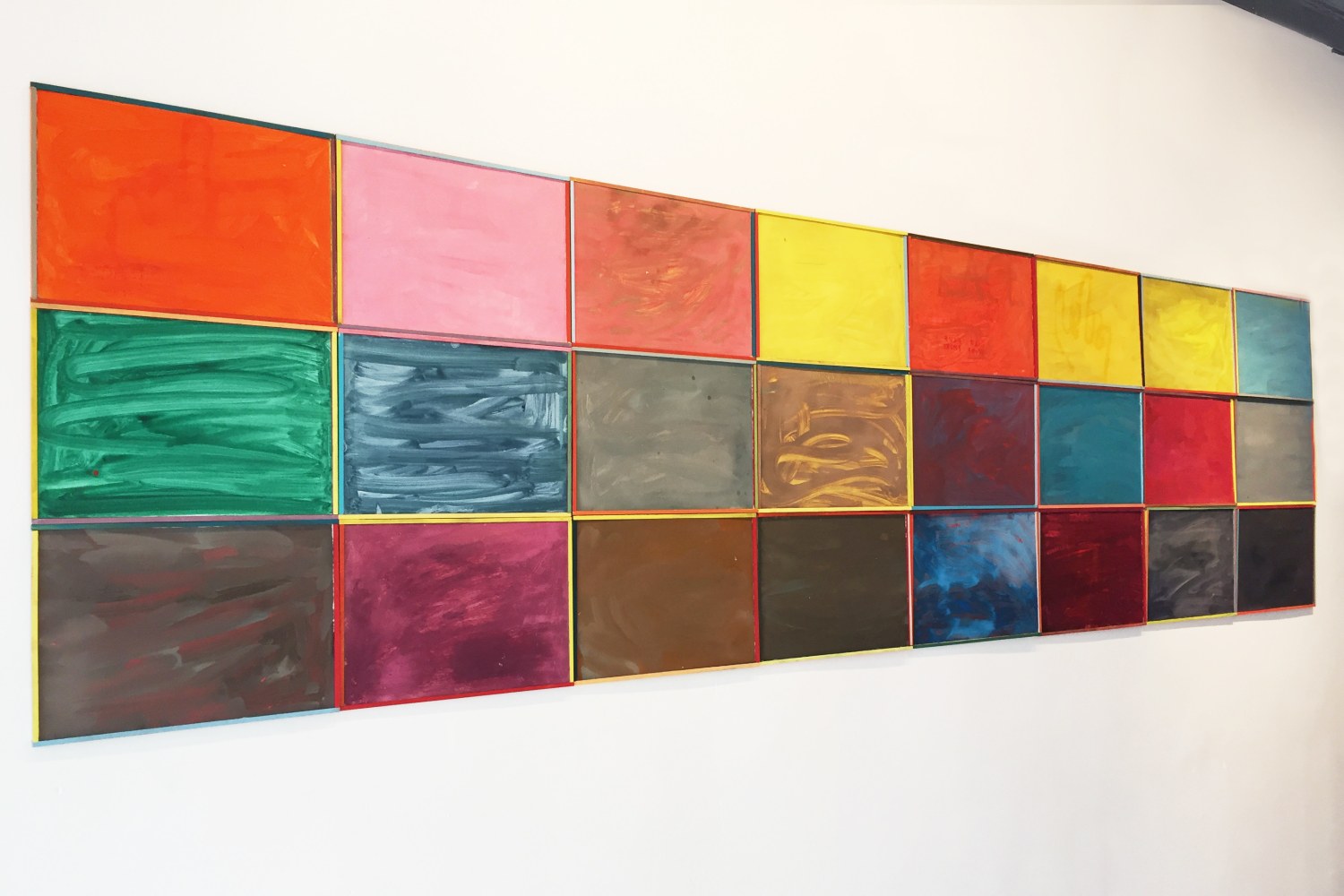 In addition to the video are combinations of small paintings in multi-colored frames, organized tightly in a grid that alludes to a sequence of video. Some depict the sentimental subject of the sun setting over a horizon of a sloppily painted field of color which might double as waves in the sea. Elsewhere, a triptych called Musée de la Chasse depicts a hunting trophy display of two cheetahs, deconstructed. Though the subject matter of these paintings is diverse, they are connected to each other through their concern with scale, pattern and framing.