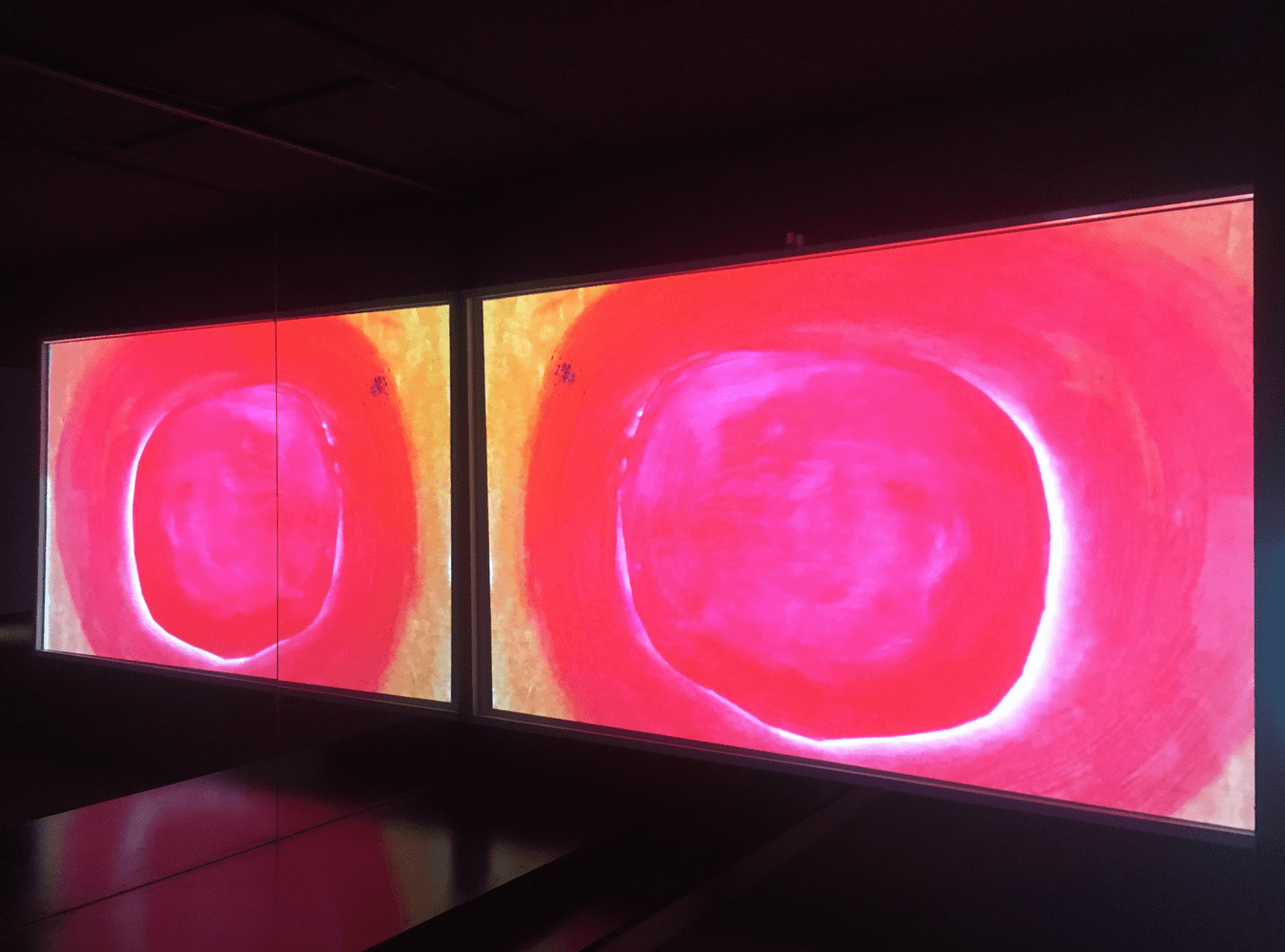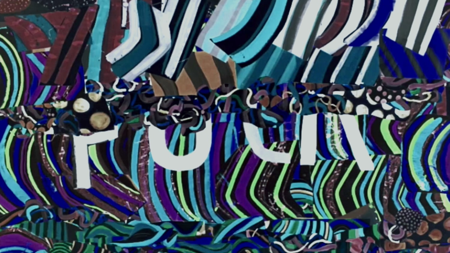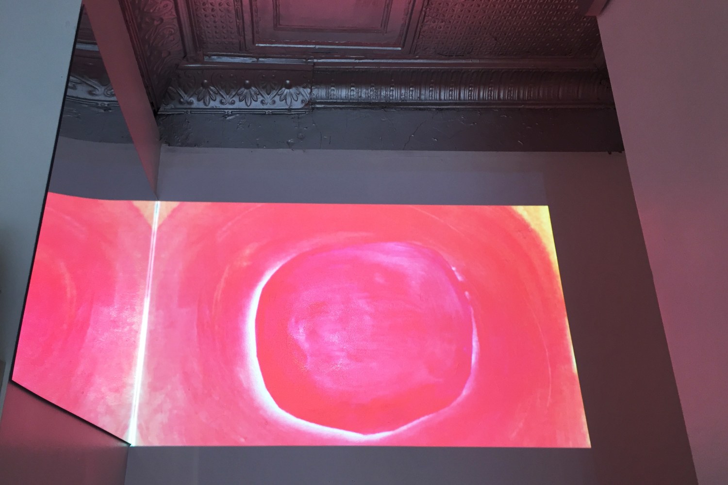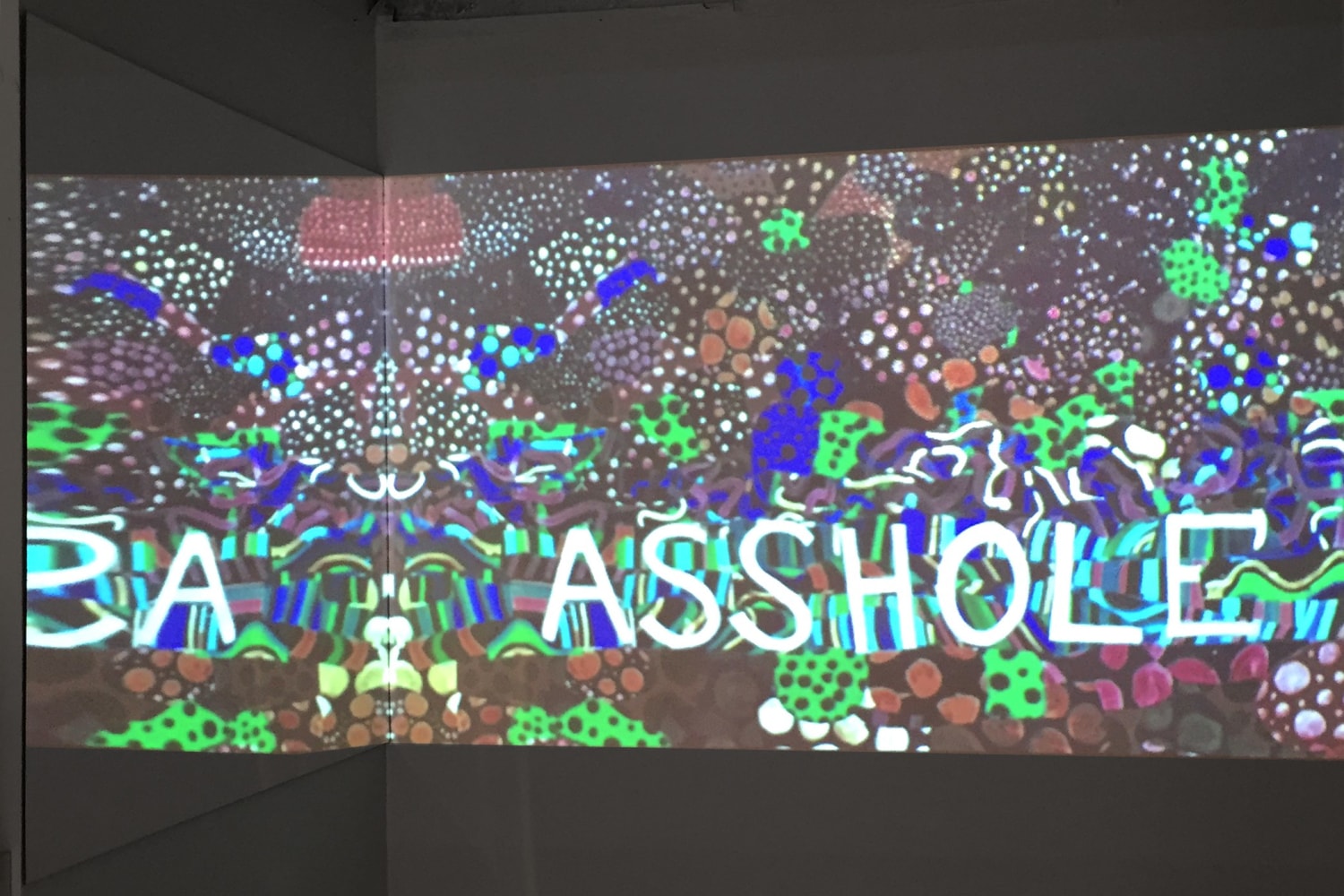 Angry Sea functions as an analogy for an irritated human brain, and Johnson approaches the animation as a “visualization of what happens in there when someone is pissed off and swearing.” He likens it to “a sort of Kusama ‘Infinity Room’” that has been agitated and injected with a sense of comic surrealism, a parallel that is reinforced by its projection onto a mirror, referencing Kusama’s own installations. A litany of swear words, written in bold block letters, springs from the teeming background of squiggles and dots with an almost naive exuberance. This undulating “sea” of profanity is interspersed with what the artist describes as “toxic sunsets,” which adds another dimension of meaning to the work. The soundtrack to the animation is the laugh track from The Cosby Show, lending an undertone of dread as well as the pervasive sense that there is something more, hidden just beyond the viewers’ perception, like an in-joke whose meaning they are not privy to.