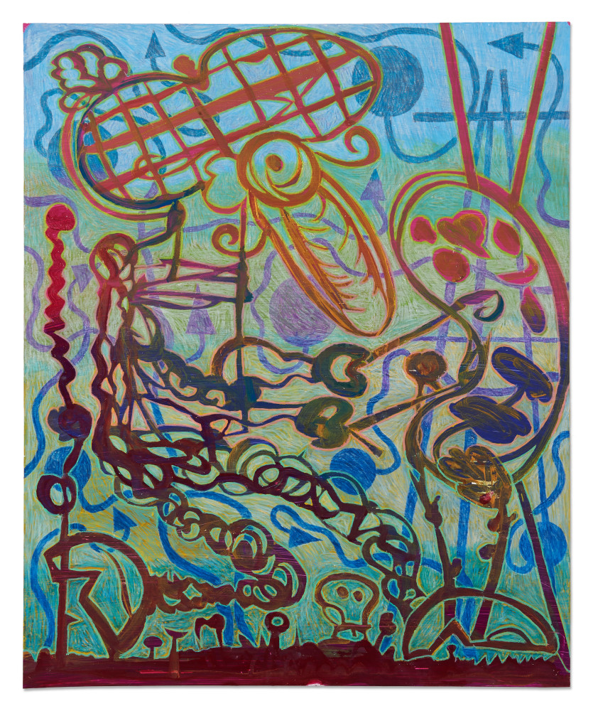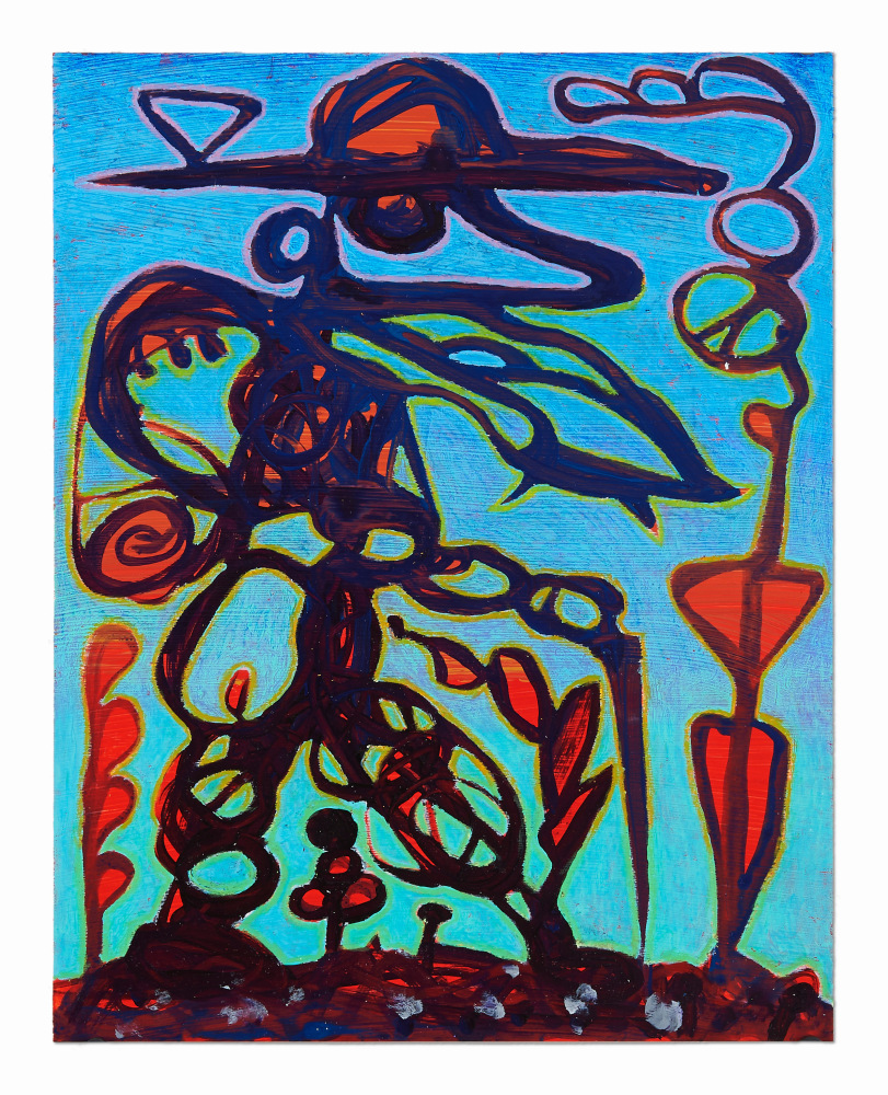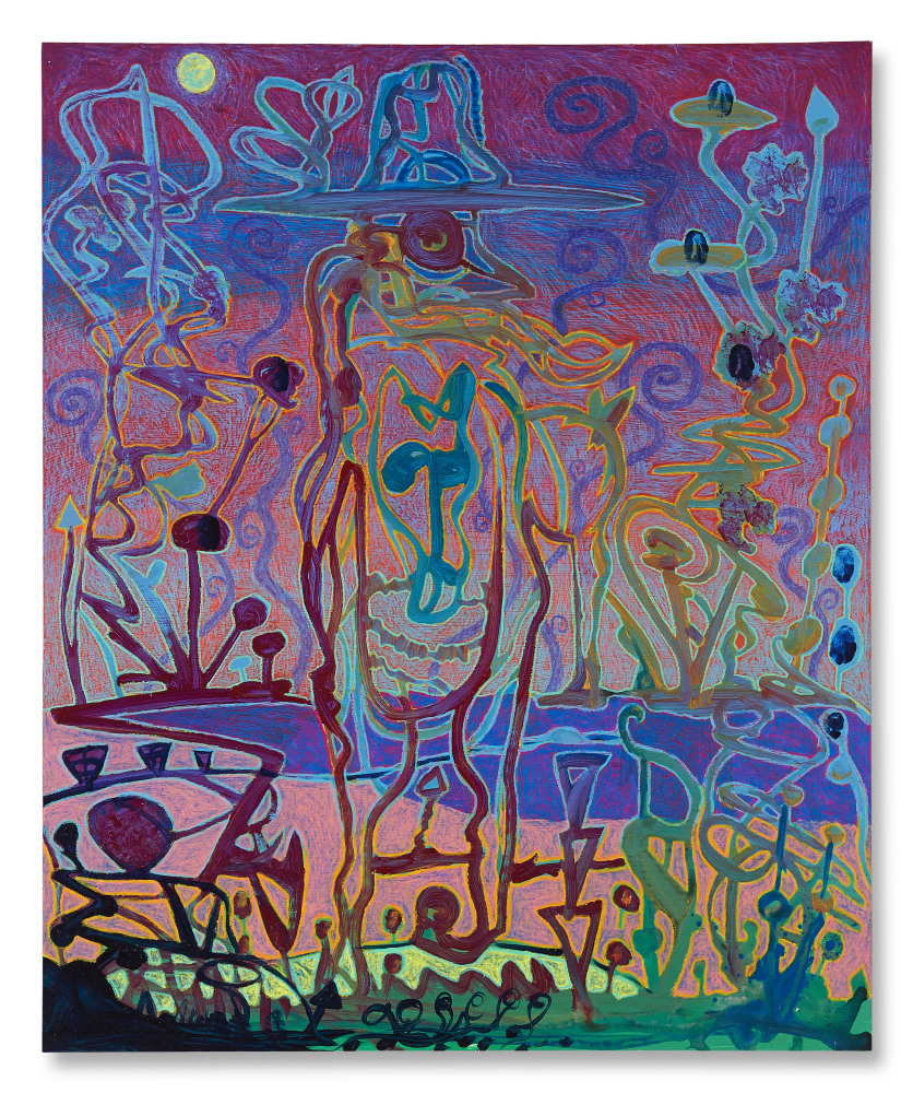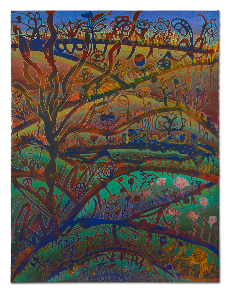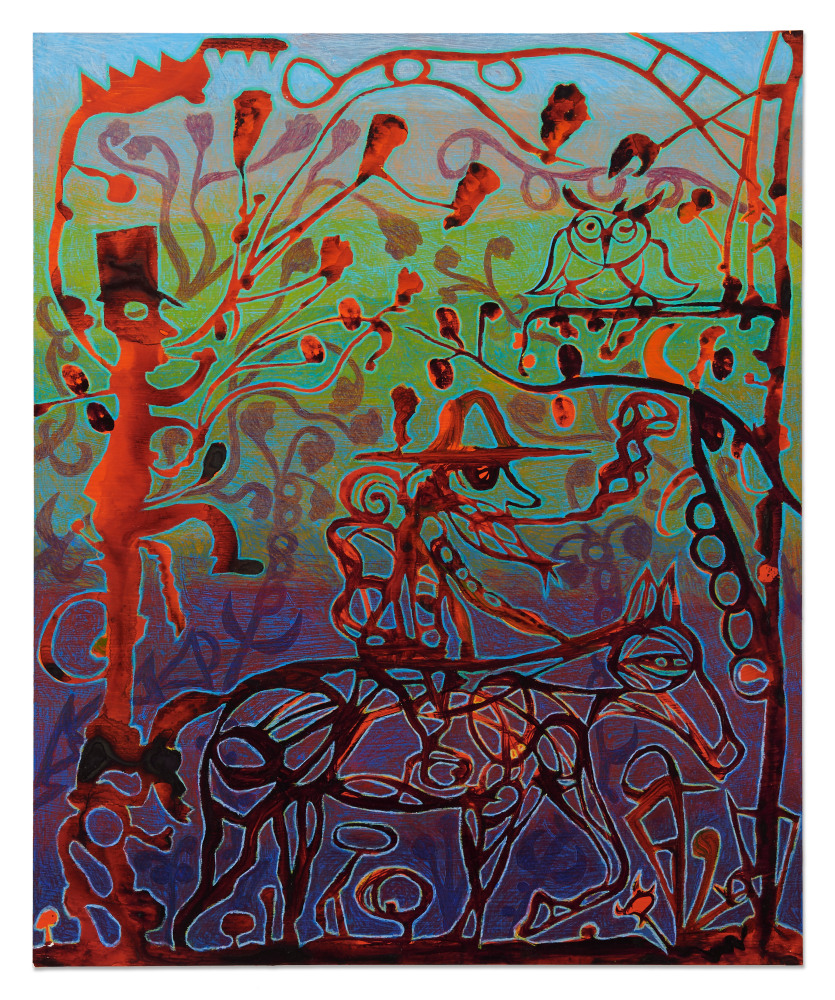 In A Peaceable Kingdom, everything is rendered on the same plane, with little to no distinction between creatures of different sizes – here, a snail is equal to an owl. The animals perch on branches and earth that are barely differentiated from their own bodies in terms of depth and mark-making, seeming at once inextricably bound to their environs while at the same time able to be knocked at any moment into the ether. In Devil Walk, the boundaries between the landscape and its inhabitants becomes further blurred, suggesting the interdependence of these creatures with one another and with the environment. Plants, animals, and human-like figures are wiry and spindly, both precariously teetering on their own edges while simultaneously intertwined with one another like webs across the canvas.