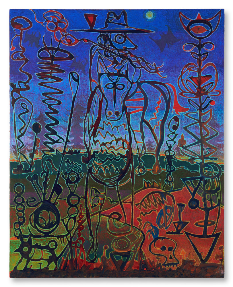 Elsewhere, Manford’s depictions of wanderers and nomads present lone riders on horseback on seemingly psychic wanderings through symbolic landscapes. In Blood Moon Wanderer, the rider holds a smoking pipe to his mouth, blazing through a lush land full of bizarre and unrecognizable fauna silhouetted against a radiant sunset sky full of pink, purple, and green. His surroundings are almost indistinguishable from his own body and that of his horse, who traverses the terrain with curled hooves and blood-red eyes. The hint of menace in these radiant worlds is further suggested in Psychic Wanderer with the inclusion of a skull and bats flying ominously against the full moon. In Manford’s own words, “The characters I depict can be devilish, and also sad, downtrodden wayfarers and Hobos that sort of embody a displaced, disenfranchised mind set; I think the imagination, which can be lost in adulthood, might actually be that 'place' from which (he) the wanderer is dislocated, and forever, perpetually trying to return to/ locate.”