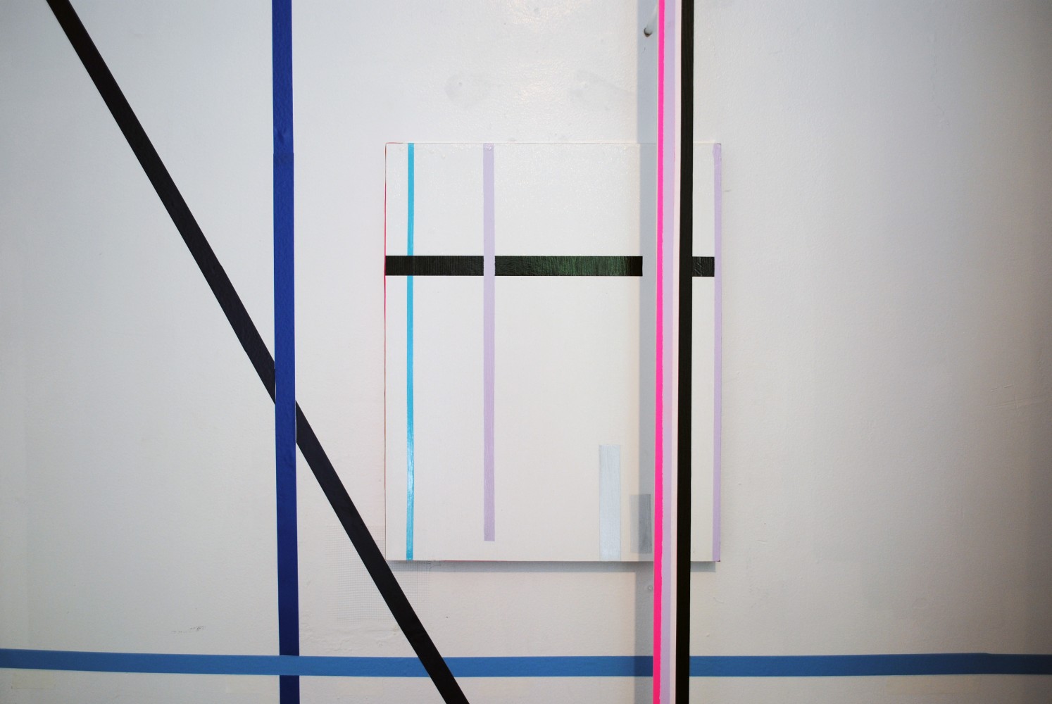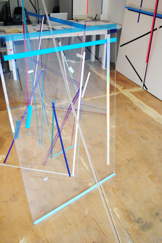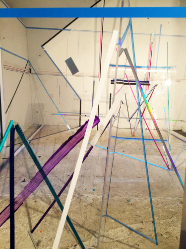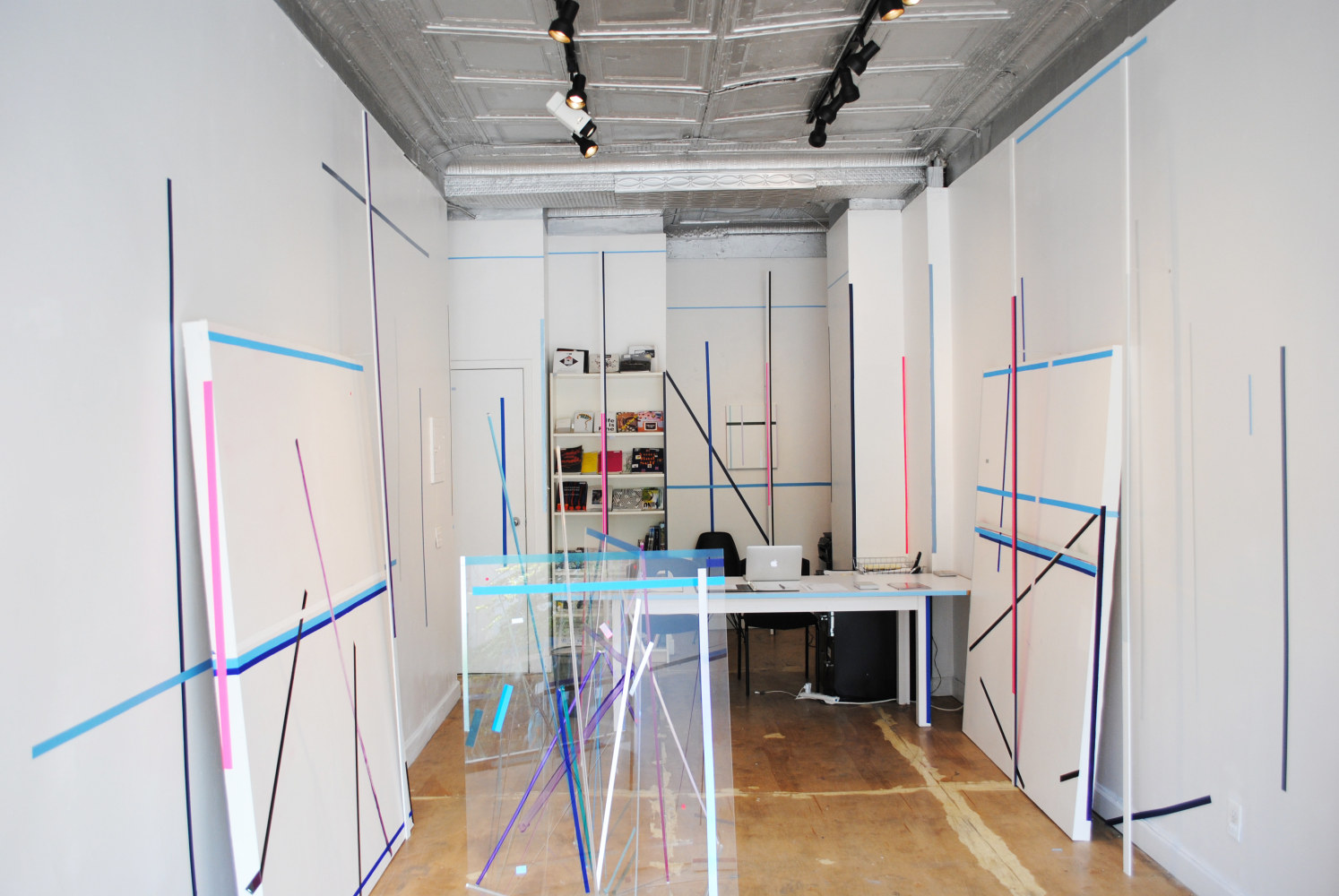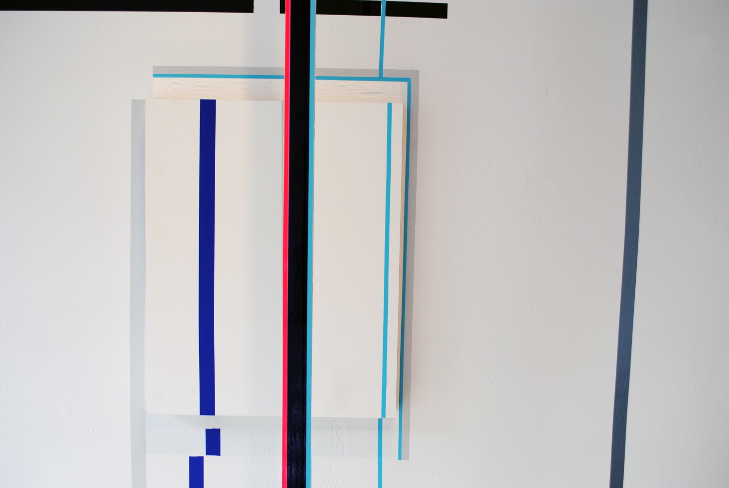The heart of Kelley Johnson’s artistic language is centered on the importance of 2D line juxtaposed by individualized 3D interactions of viewers within his landscape. Space and structure are key elements that determine the framing of his art and installations. Johnson’s sculptural paintings are fastidiously fashioned from layers of acrylic and vinyl strips, moldings, mirror and tape. The components flow from the canvas and connect to adjacent walls, extending into the room to animate the space as explored. Walking through these elements creates a movement of experience, evoking infinite patterns with interactive shapes, shadows, and colors. Planes obscure one another, while varying spaces open and close. The shadows dance against light, as the plastic planes reveal shifting forms, conjuring colors and designs that weave in and out of webbed sections. With this range of vantage points, the space is built from the floor up and the wall outwards, lifting the viewer into an immersive journey all his own.
