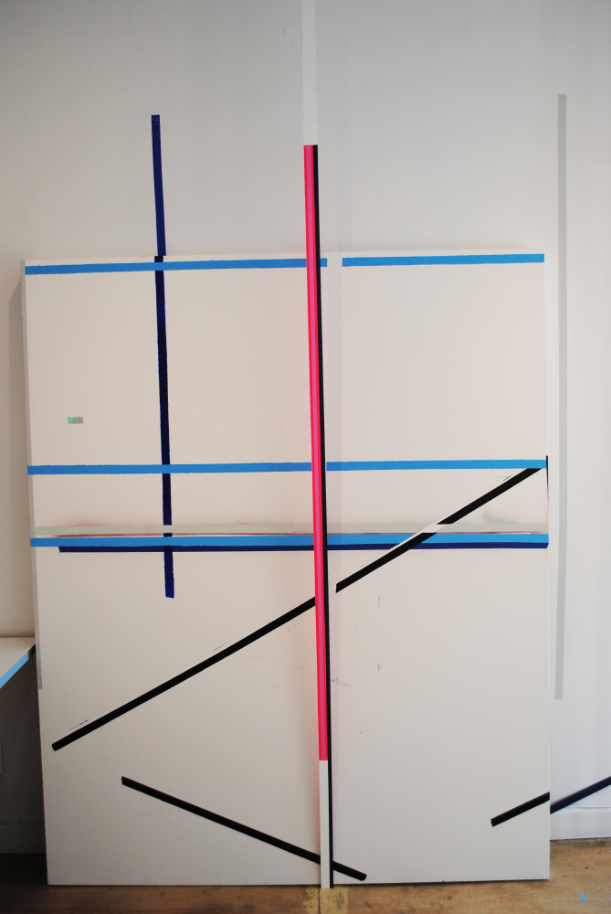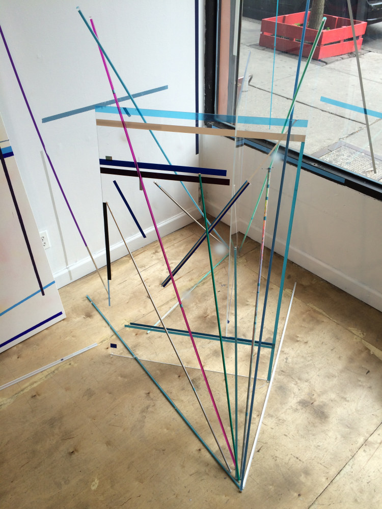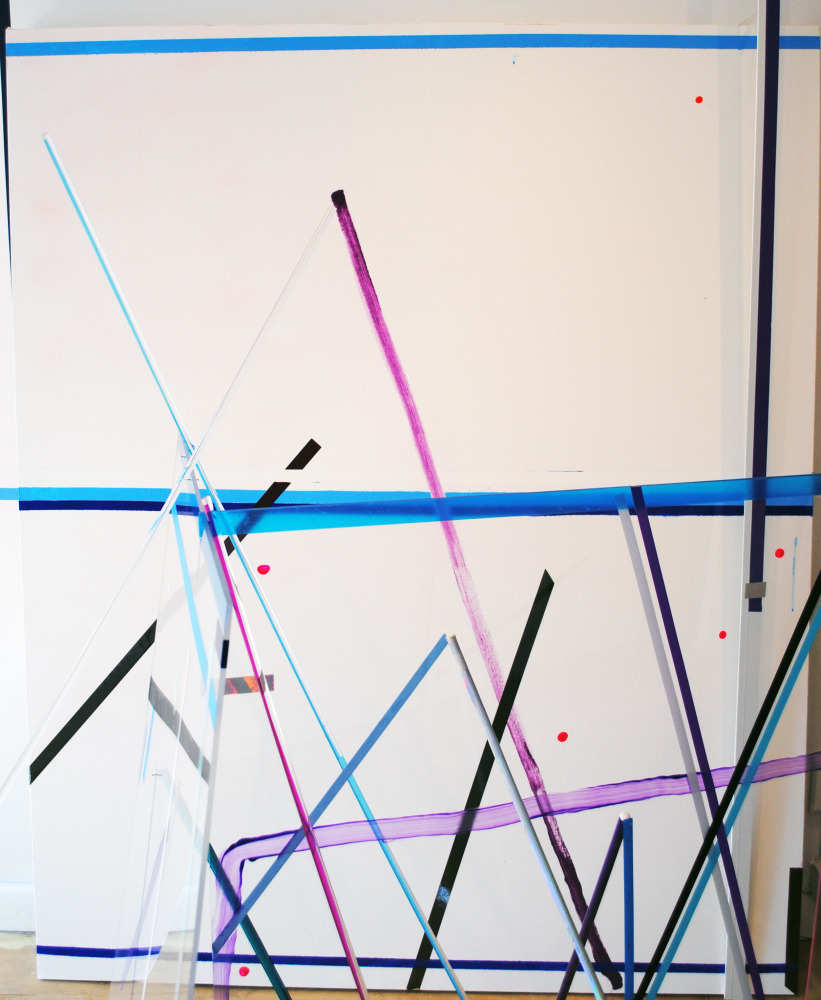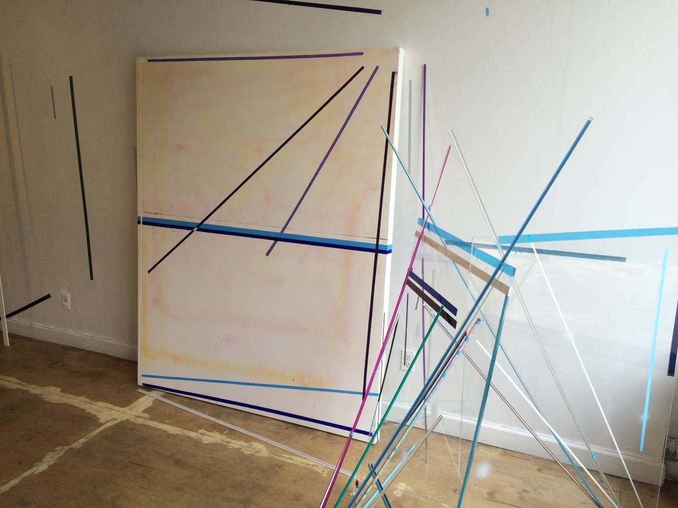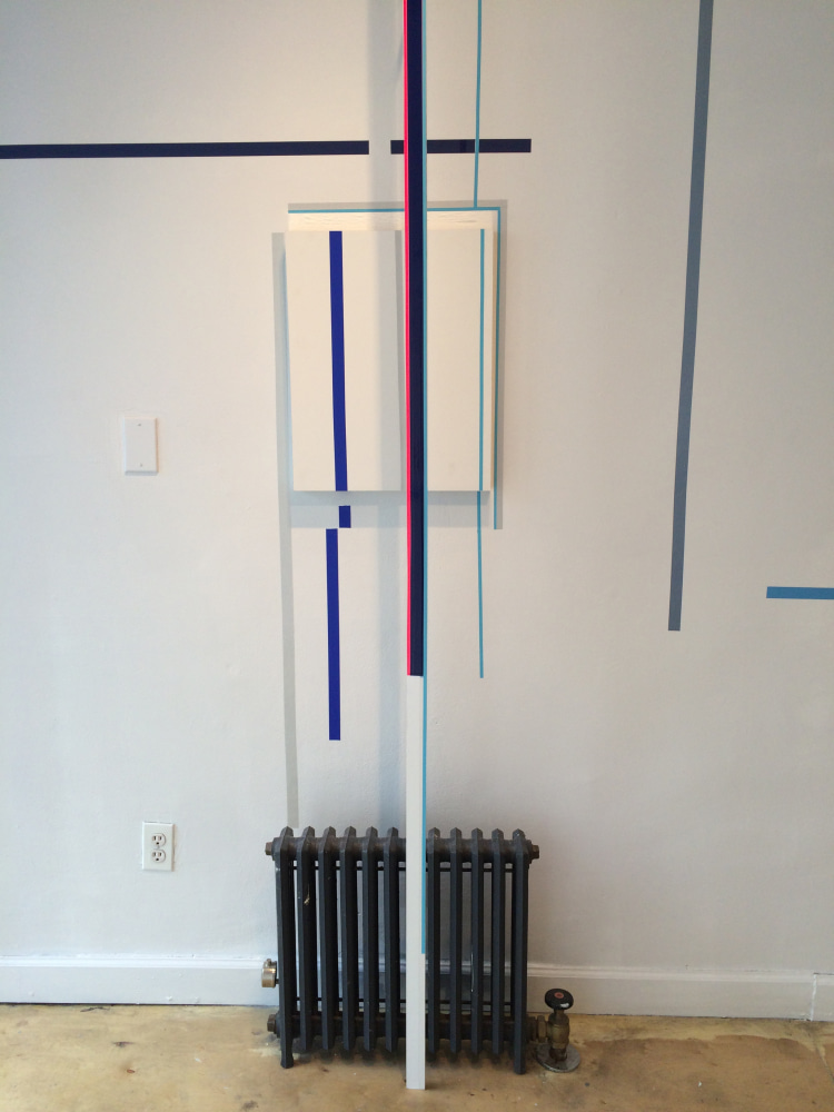 The heart of Kelley Johnson’s artistic language is centered on the importance of 2D line juxtaposed by individualized 3D interactions of viewers within his landscape. Space and structure are key elements that determine the framing of his art and installations. Johnson’s sculptural paintings are fastidiously fashioned from layers of acrylic and vinyl strips, moldings, mirror and tape. The components flow from the canvas and connect to adjacent walls, extending into the room to animate the space as explored. Walking through these elements creates a movement of experience, evoking infinite patterns with interactive shapes, shadows, and colors. Planes obscure one another, while varying spaces open and close. The shadows dance against light, as the plastic planes reveal shifting forms, conjuring colors and designs that weave in and out of webbed sections. With this range of vantage points, the space is built from the floor up and the wall outwards, lifting the viewer into an immersive journey all his own.