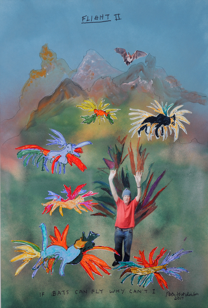 Hutchinson's taste for ironic, dry humor is also on display in the exhibition. Flight II shows the artist with raised arms amidst a variety of flying creatures, including a bat and winged horses and cats. They are rendered in an almost childlike manner, and the text at the bottom of the work (“If bats can fly why can't I”) furthers this sense of naivety. Though compelling in themselves, these works show the range of expression that Hutchinson is able to refract from his natural subjects; along with impressions of the surreal and sublime, as evinced in other works, is a playful, almost curious irony.