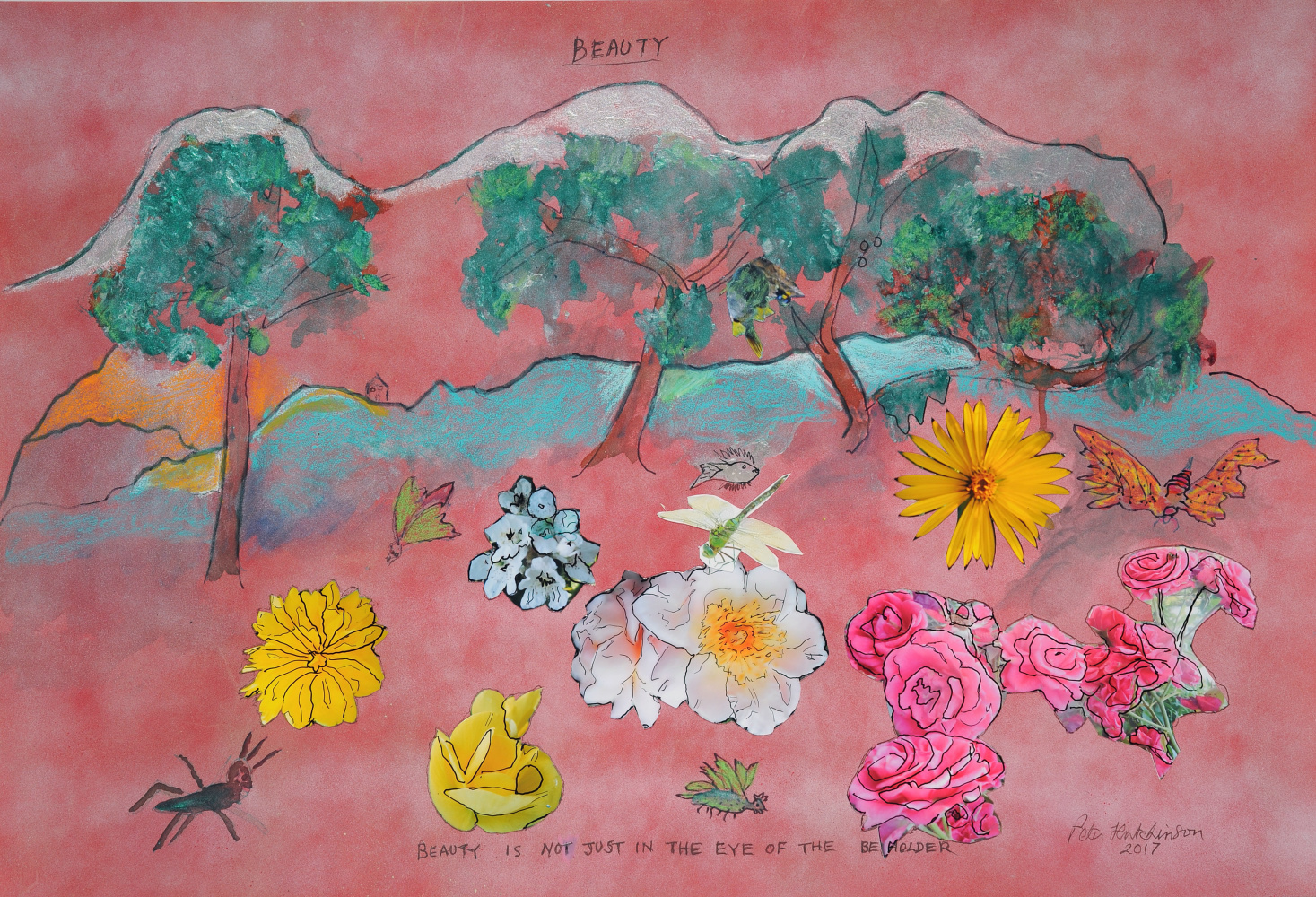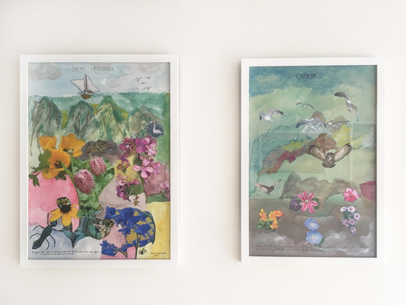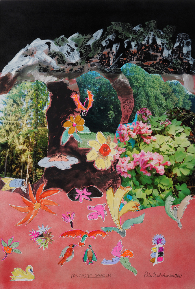 The works in the exhibition feature painting and drawing more prominently than in earlier works, although collage remains the primary medium. Dream Landscape pairs cut out images of flowers and insects with a painted background of trees and a sailboat approaching on the horizon; the coexistence of the flowers, which were photographed in Hutchinson's garden, with the fantastical image of the sailboat lends the image a current of ambiguity, as if unplaceable in time or existence. The artist's own words, written at the bottom (“I grew these flowers at some cost, but the insects came for free. The garden intersects with insects”) does little to abate this sense of mystery, instead hinting at a greater interconnectivity. Fantastic Garden and Beauty set cut-out images of flowers, both photographed and painted, against vivid pink backgrounds, embellishing their inherent beauty and showcasing their rich formal possibilities.