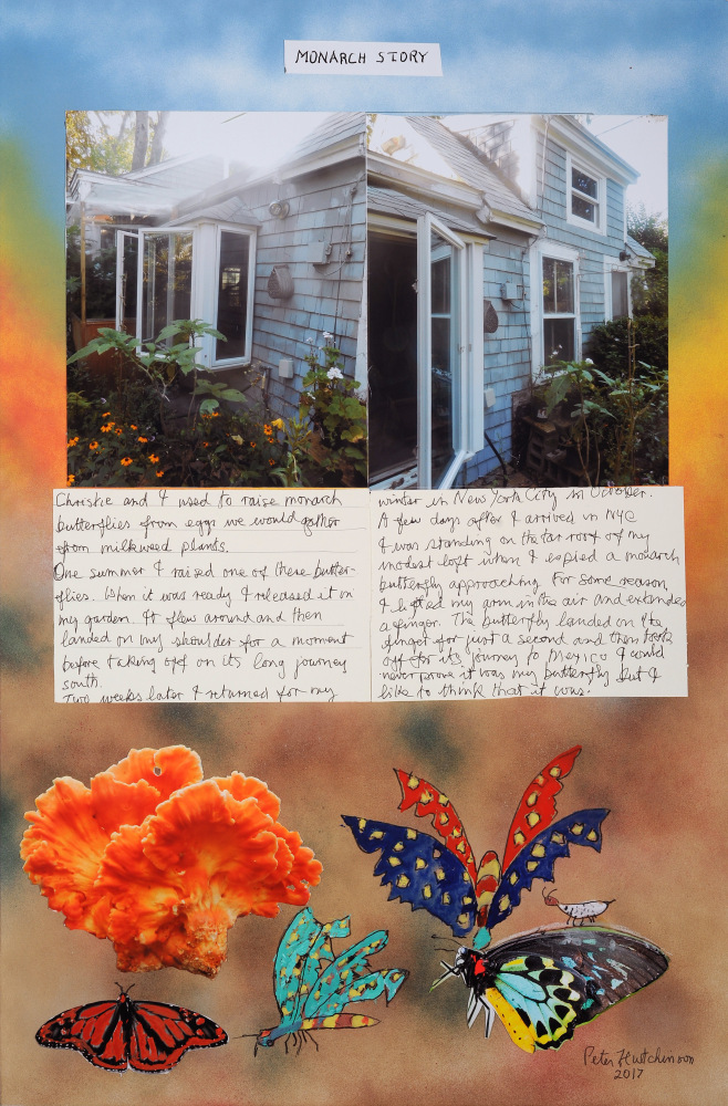 One work in the exhibition, Monarch Story, features a photograph of his garden and studio, along with text that recounts the time he encountered a Monarch butterfly in New York City and believed it to be one of the butterflies he raised in his garden. This sense of fantasy, evoking a sort of magical realism, runs throughout his oeuvre. Hutchinson's work invites the viewer to adopt something of his own perspective, allowing one to apprehend the infinite possibilities suggested by nature, particularly that of a small scale, personal sort – he has no interest in the more monumental expressions commonly associated with Land Art, and the diaristic foundations of his practice give it a pronounced individuality. Though his work inevitably evokes associations with an array of artists and writers, from Robert Smithson to the Transcendentalists, among countless others, it seems entirely unfitting to classify him as a member of any movement.