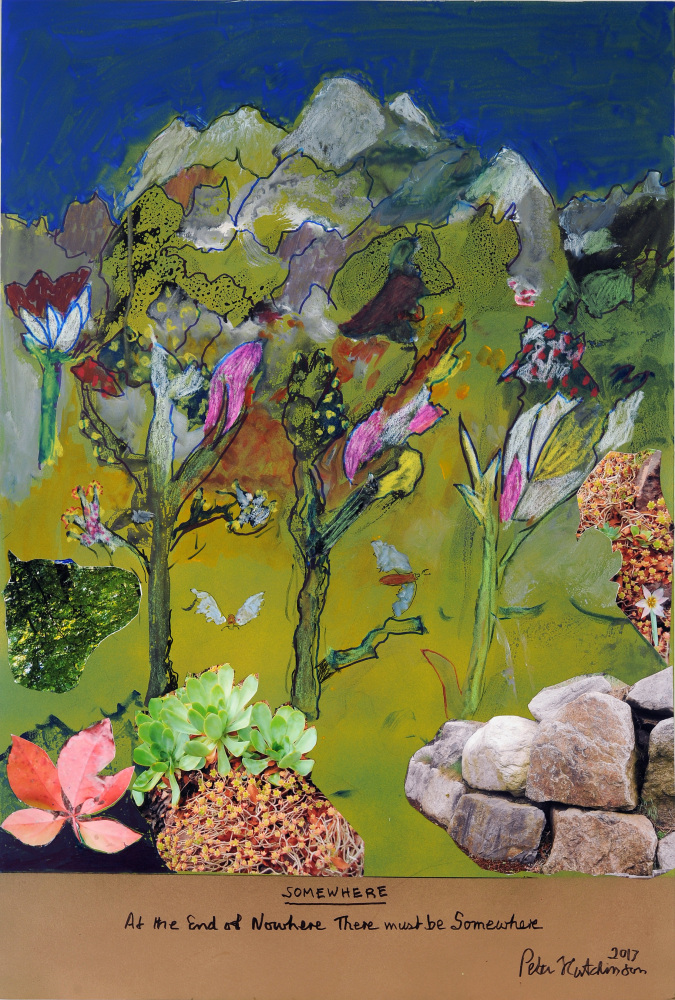 Over the course of his career, Hutchinson has developed a distinct artistic practice that fuses Land Art, diaristic text, and photo-based collage, underscored by a romantic and enigmatic conception of nature and travel. His art is in many ways an extension of his own highly personal connection with nature; he tends to a uniquely evolved garden at his Provincetown studio, and has long maintained a vegetarian diet.