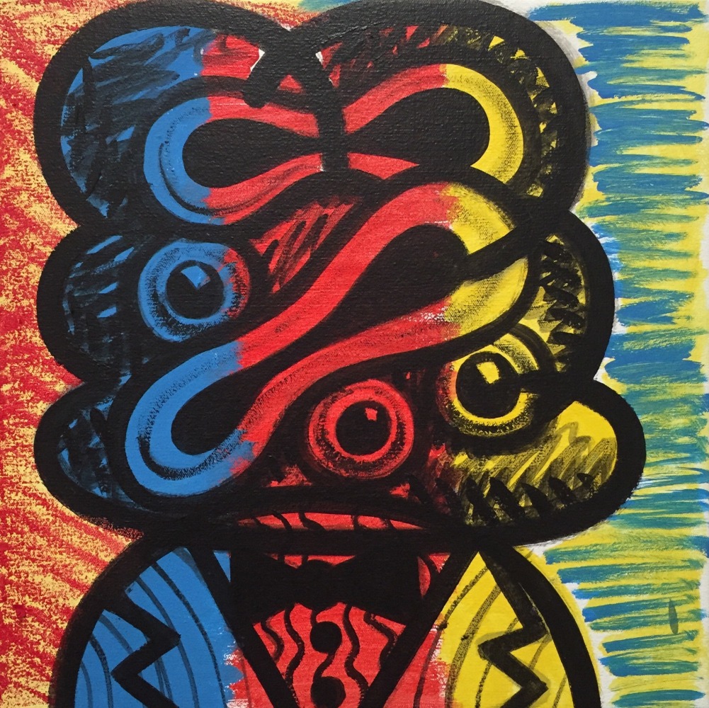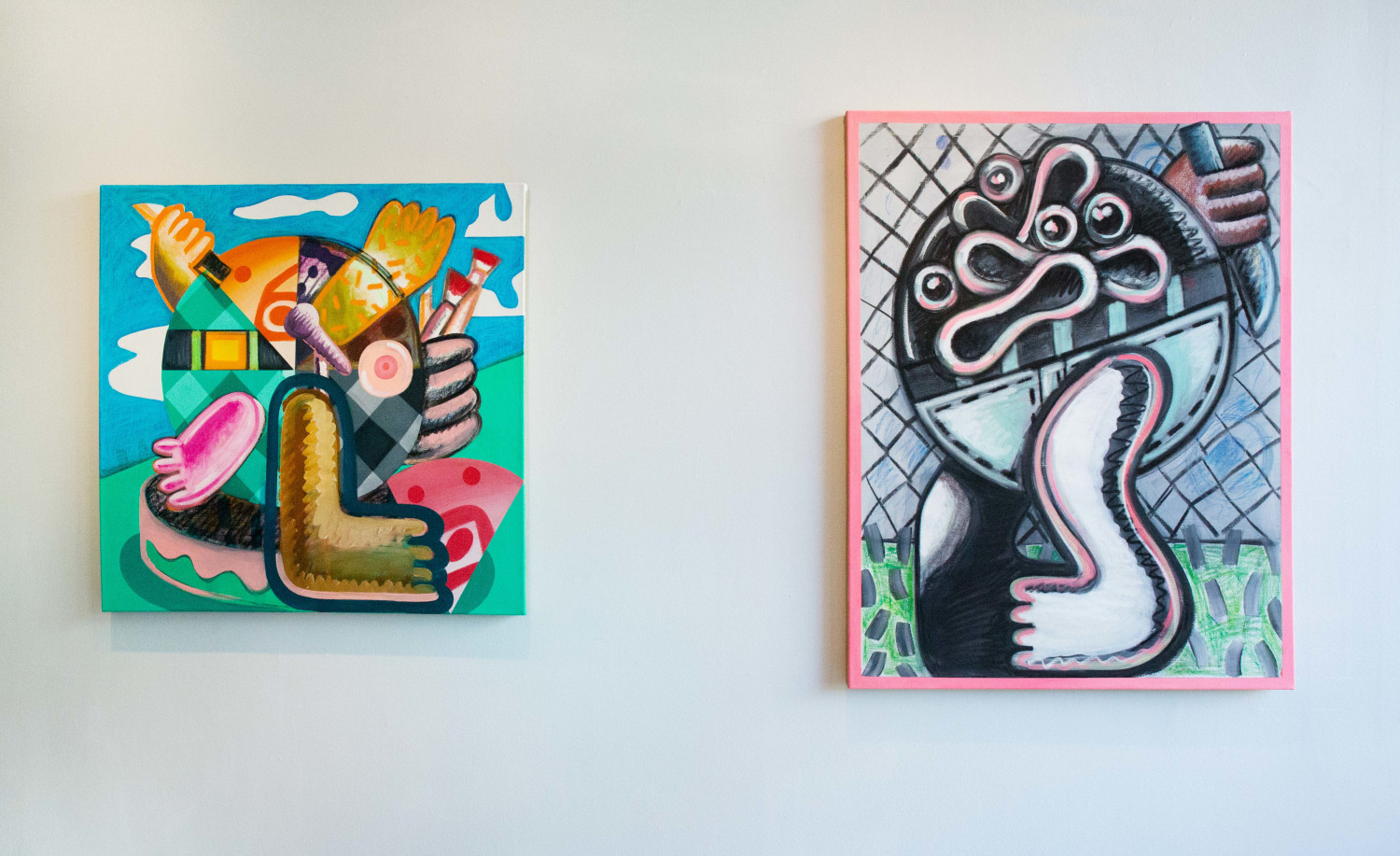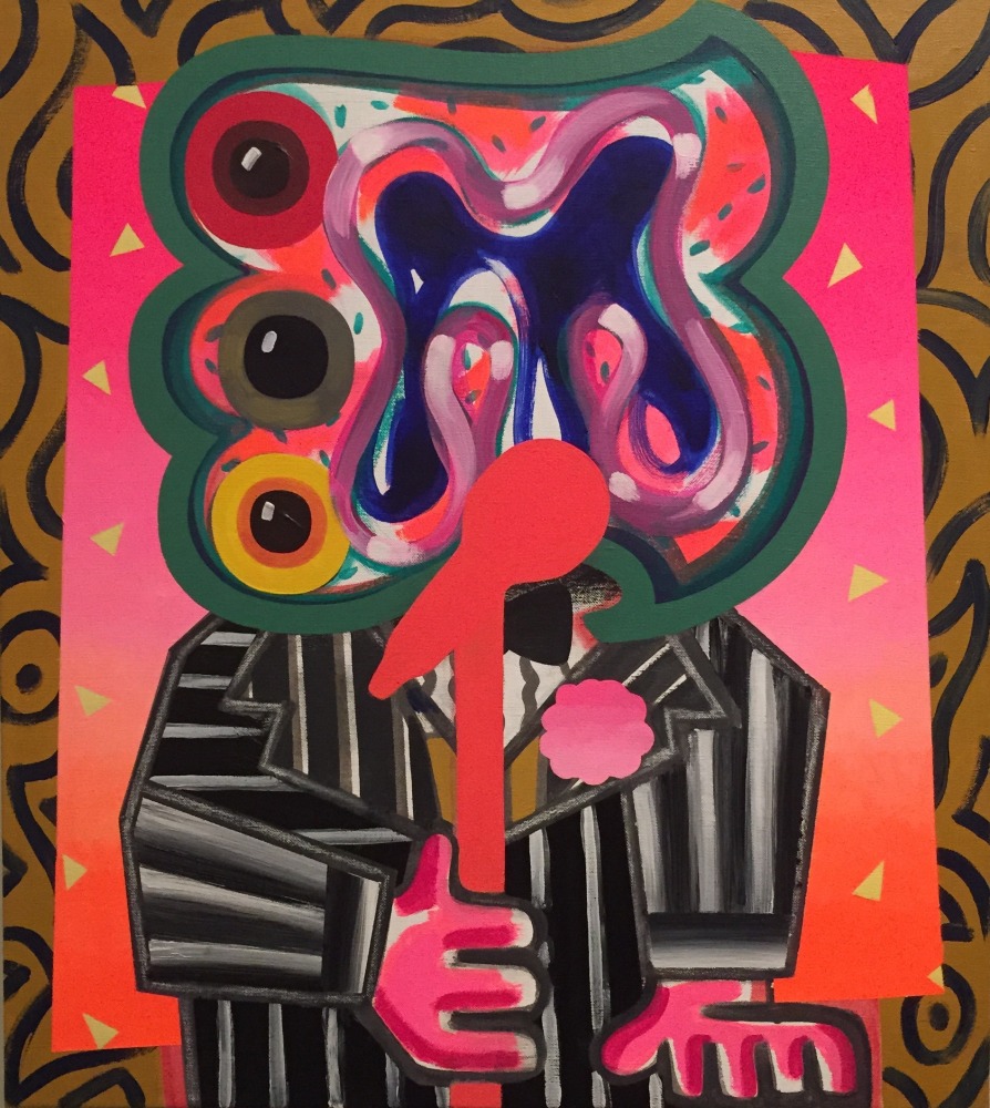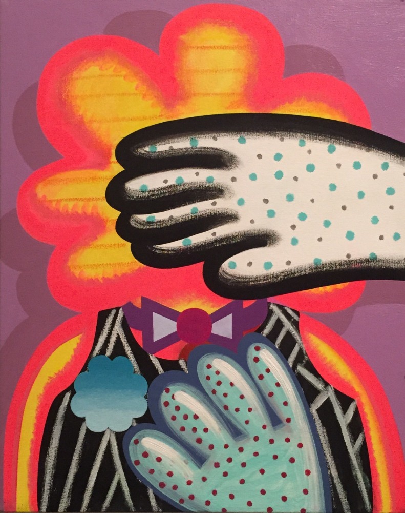 These works rely heavily on modern-day symbolism and familiar shapes to convey their message. The characters do not mean to represent anyone in particular, but rather to represent everyone on a universally relatable level. However, Schenck is quick to acknowledge their autobiographical nature. Of all of the pieces, it is If Looks Could Kill, a portrait of a bulbous creature in a suit, with which the artist identifies with the most. Instead of knives or paintbrushes, this figure wields a radioactive microphone, poised before what one must assume is his mouth-orifice. "[It] is a nod to stand-up comedy, something I did for a few years," he divulges. "I envision him halfway into his joke and perhaps not getting to the punchline, just in an awkward pause."