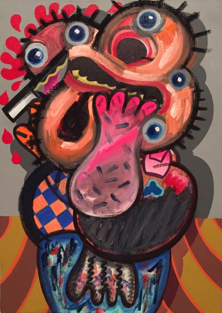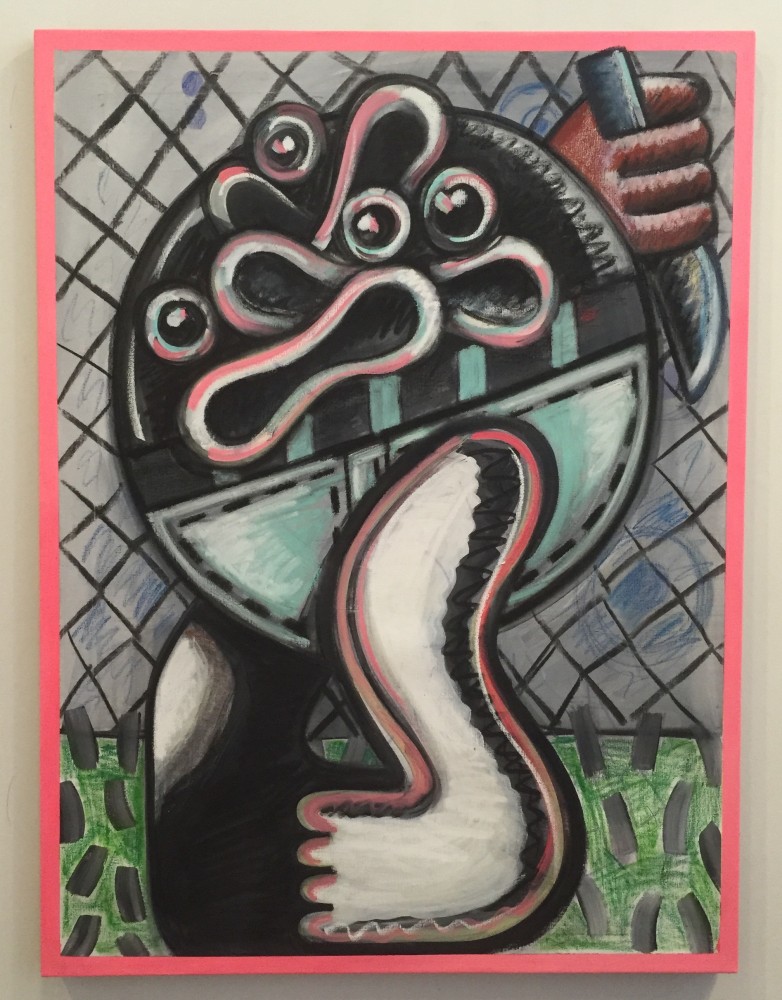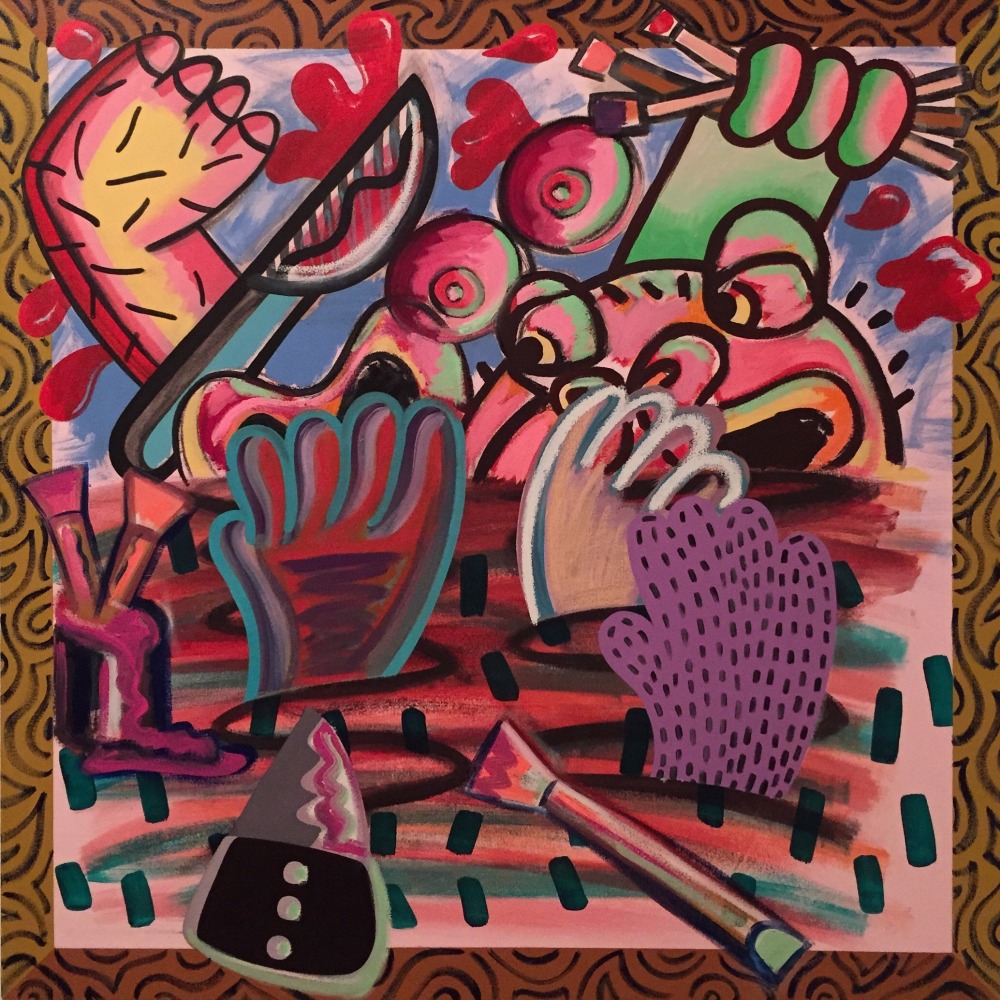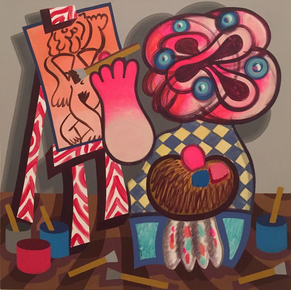 In In the Studio, a distorted humanoid stands before an easel, though it is unclear whether the creature is looking at the canvas or at the viewer, in an act of creation or confrontation. "This body of work deals with both creative and destructive acts," says the artist of this ambiguity, a recurring theme throughout the exhibition. "Many of the figures in these works are clutching knives or brushes, or both." Also recurring throughout this series are allusions to blood, eruptions, and various explosions, which might be considered violent were they not executed with Schenck's lighthearted, almost cartoony touch.