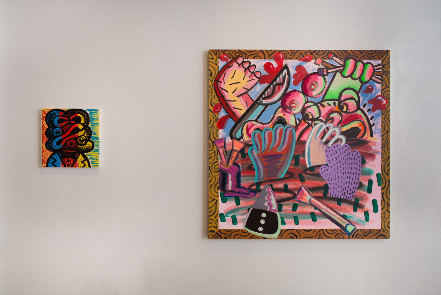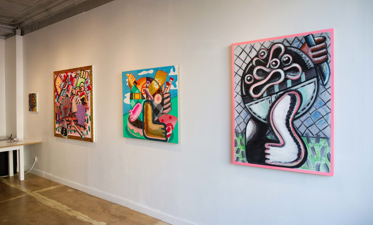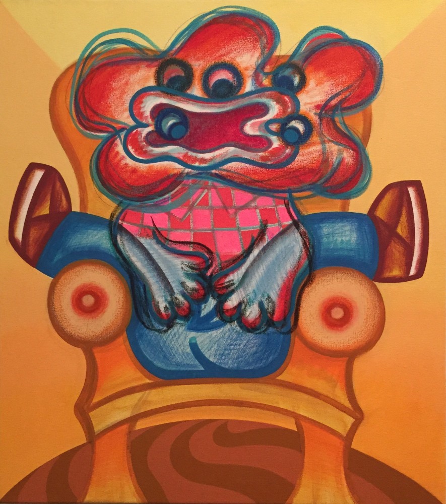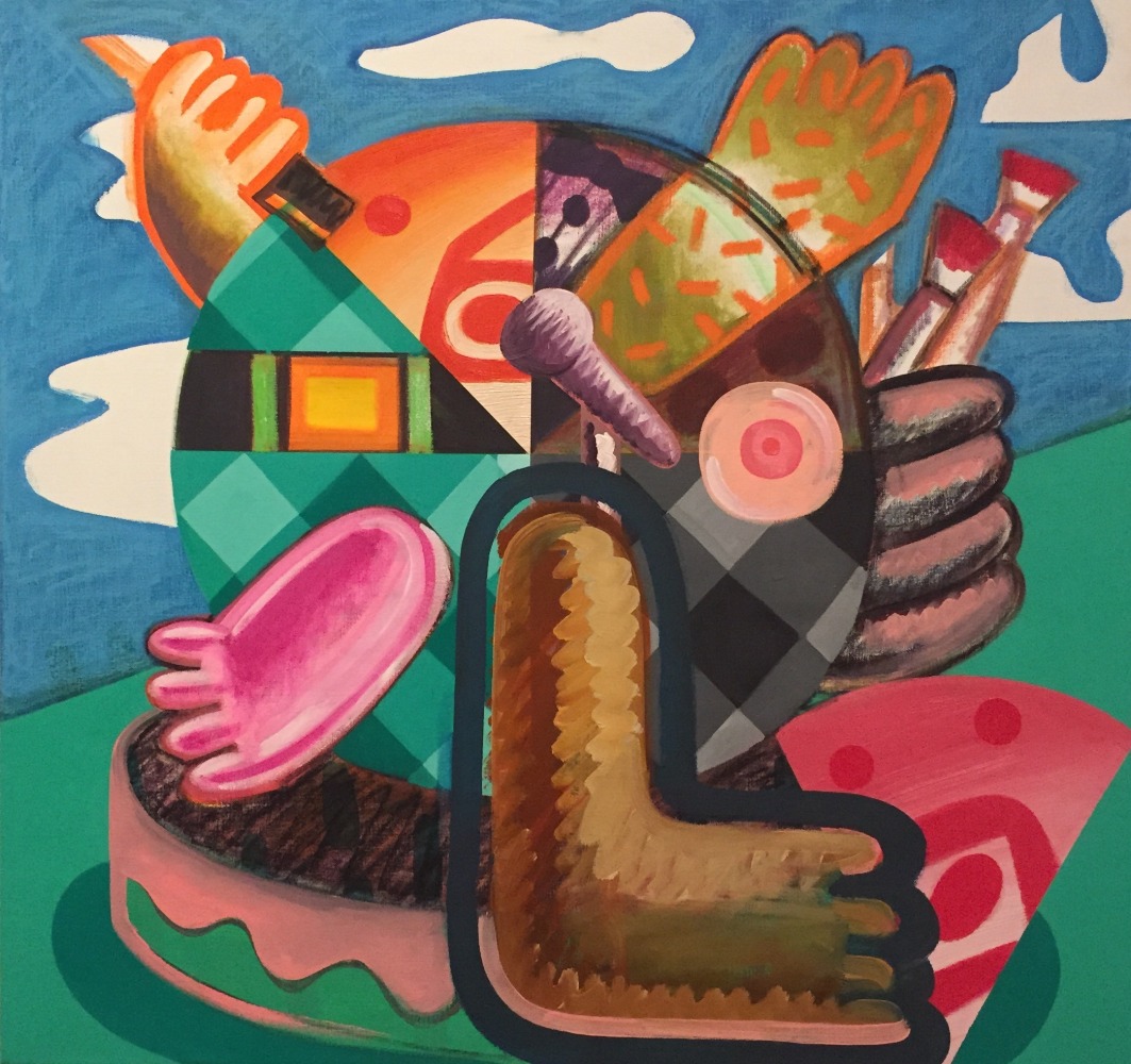 In In the Studio, a distorted humanoid stands before an easel, though it is unclear whether the creature is looking at the canvas or at the viewer, in an act of creation or confrontation. "This body of work deals with both creative and destructive acts," says the artist of this ambiguity, a recurring theme throughout the exhibition. "Many of the figures in these works are clutching knives or brushes, or both." Also recurring throughout this series are allusions to blood, eruptions, and various explosions, which might be considered violent were they not executed with Schenck's lighthearted, almost cartoony touch.