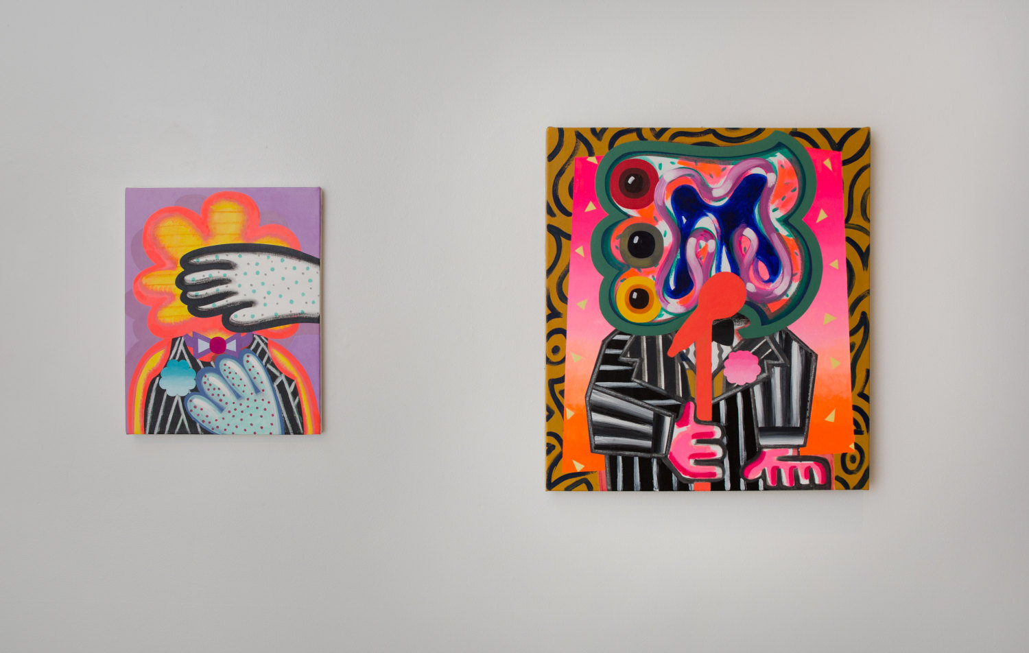 Speaking of his subjects, the artist acknowledges, "My figures are loud and bright, but they are equally evasive and on guard." From stand-up comedians to tuxedo-clad lounge singers to an artist in the studio, each character serves as a vessel, a symbolic representation of fleeting daily experiences scarcely acknowledged and rarely examined.