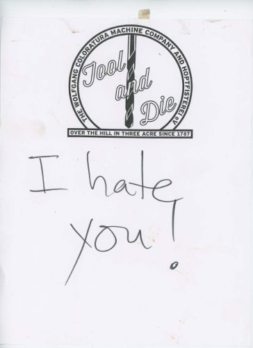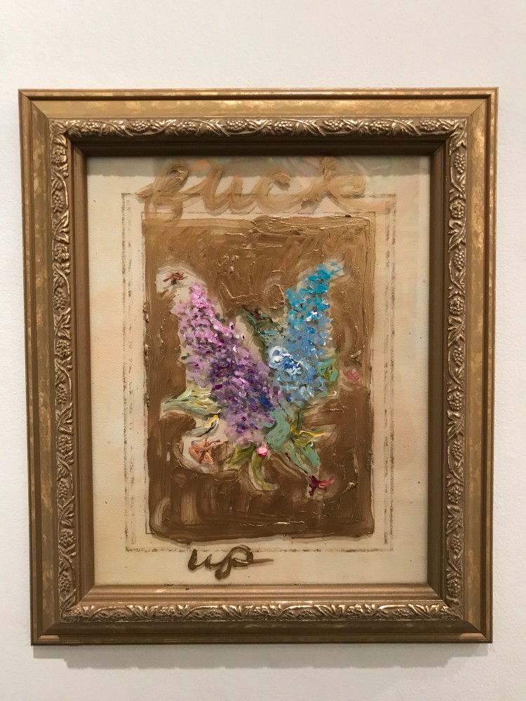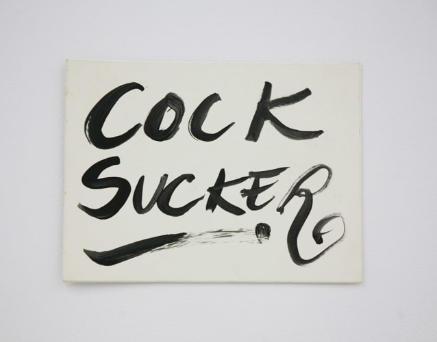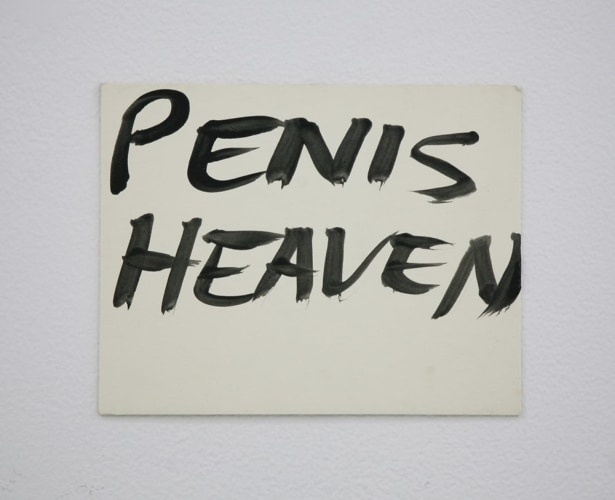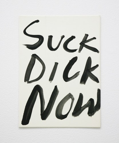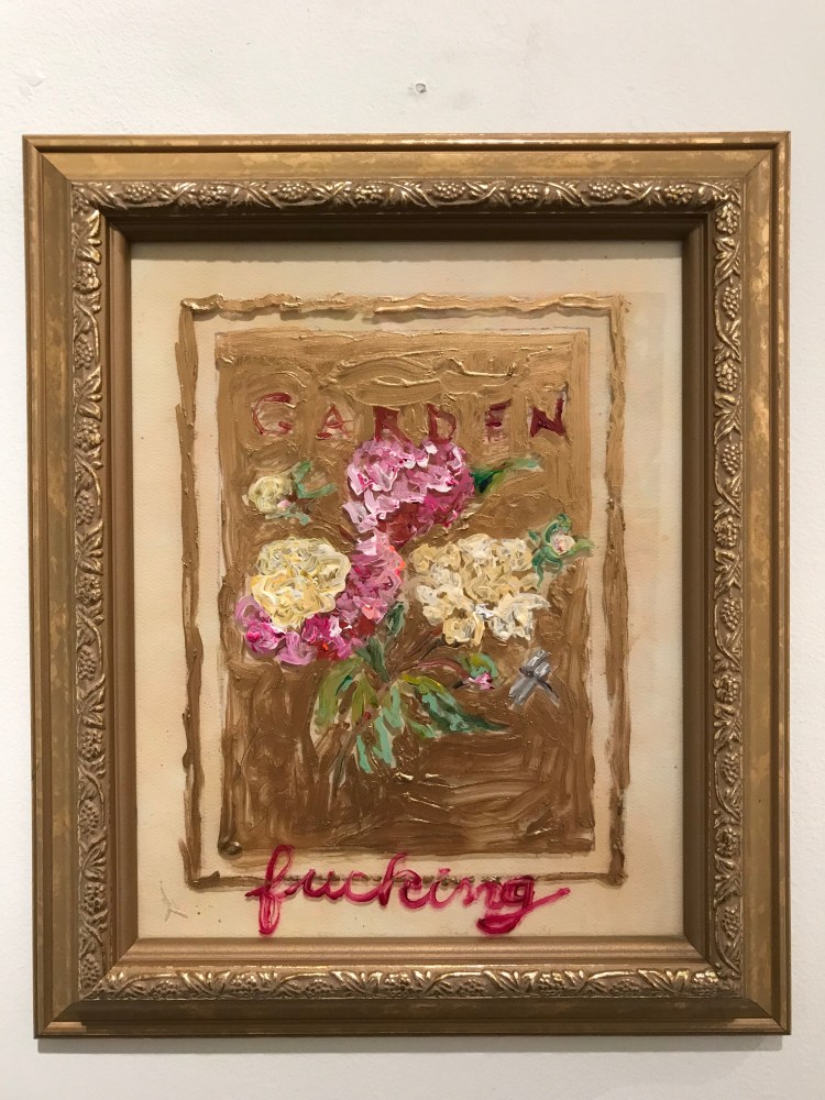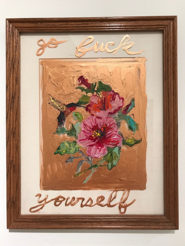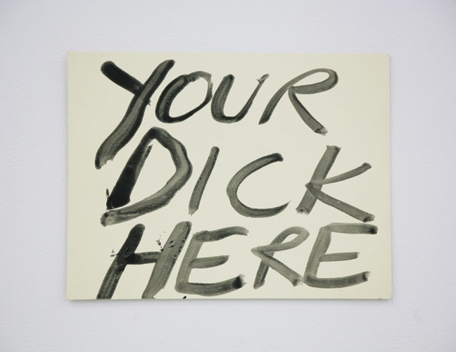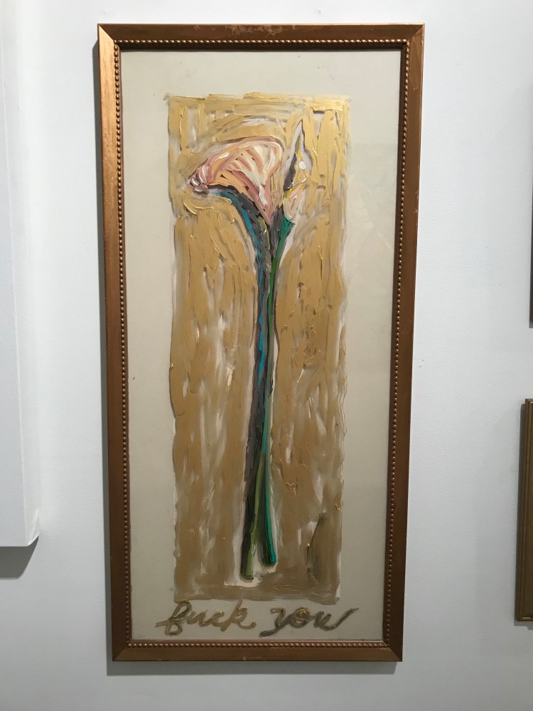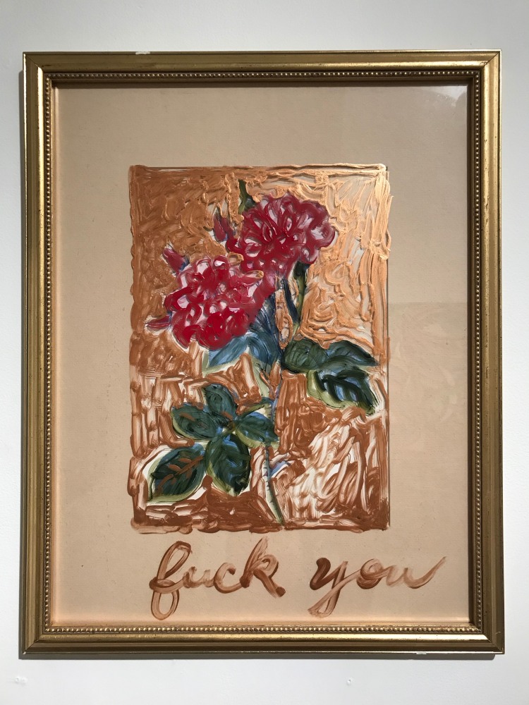 Bel Fullana depicts a childlike couple engaged in doggy-style outdoor sex complete with a banana, cherries and a rainbow. There’s (possibly) not a shred of irony in her exuberant and joyful depiction. Karen Finley’s irreverent still-lifes of bouquets in elaborate gilded frames branded with variations of “Fuck You”, turn a usual Hallmark epigraph upside down - true romance gone awry. The same is true for Joshua Abelow’s text/image drawing True Romance - sinister undertones of goblins and predators lurk behind the artist’s simple graphite rendering of love’s quest.