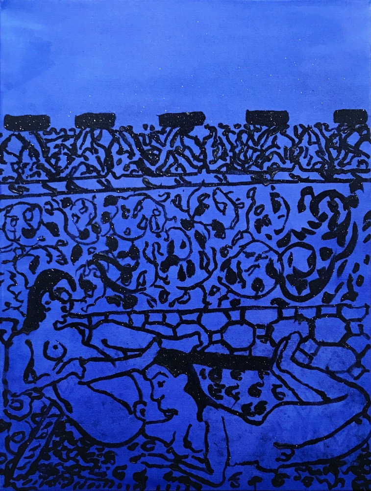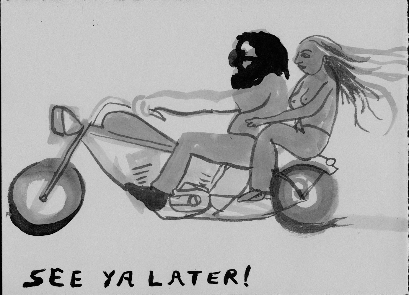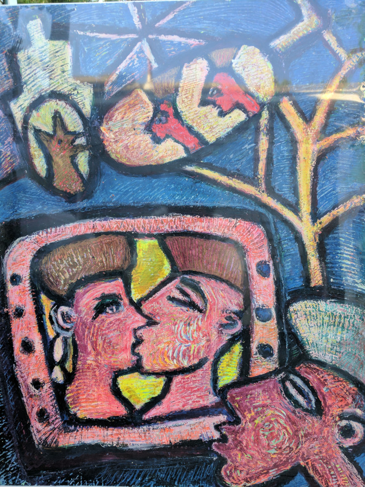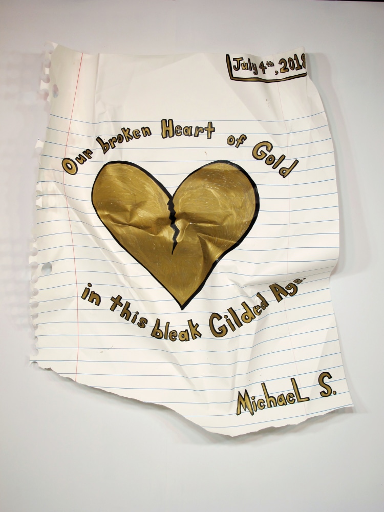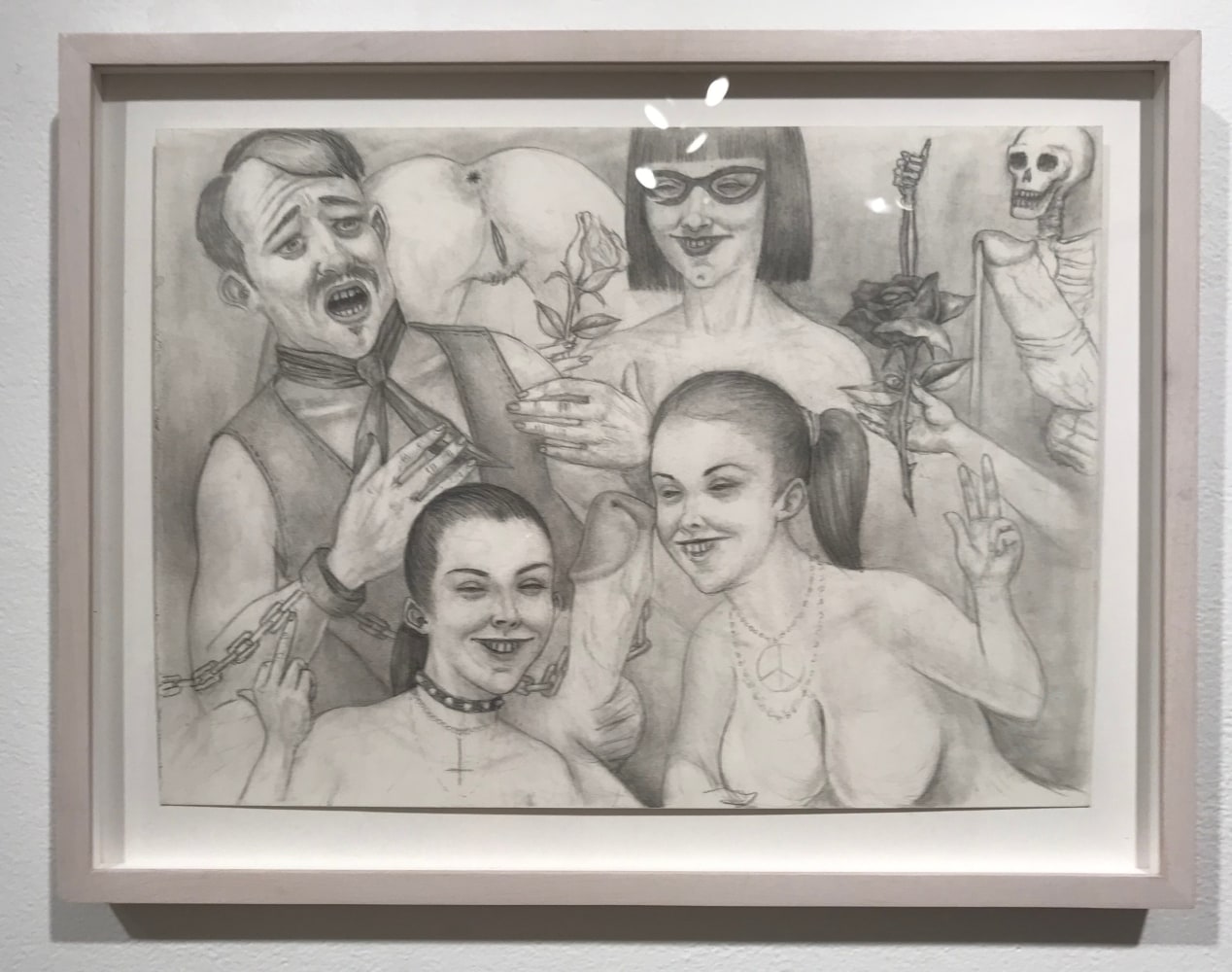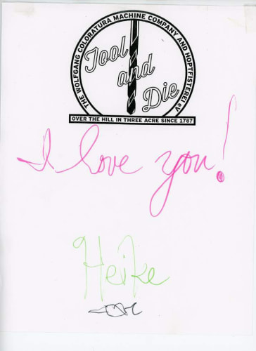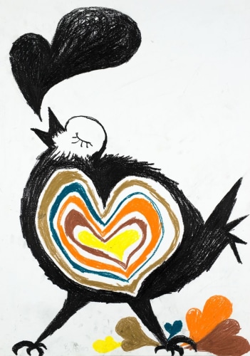 Bel Fullana depicts a childlike couple engaged in doggy-style outdoor sex complete with a banana, cherries and a rainbow. There’s (possibly) not a shred of irony in her exuberant and joyful depiction. Karen Finley’s irreverent still-lifes of bouquets in elaborate gilded frames branded with variations of “Fuck You”, turn a usual Hallmark epigraph upside down - true romance gone awry. The same is true for Joshua Abelow’s text/image drawing True Romance - sinister undertones of goblins and predators lurk behind the artist’s simple graphite rendering of love’s quest.