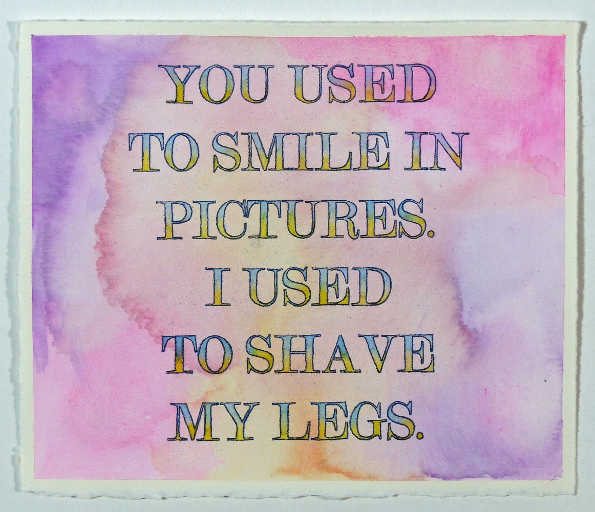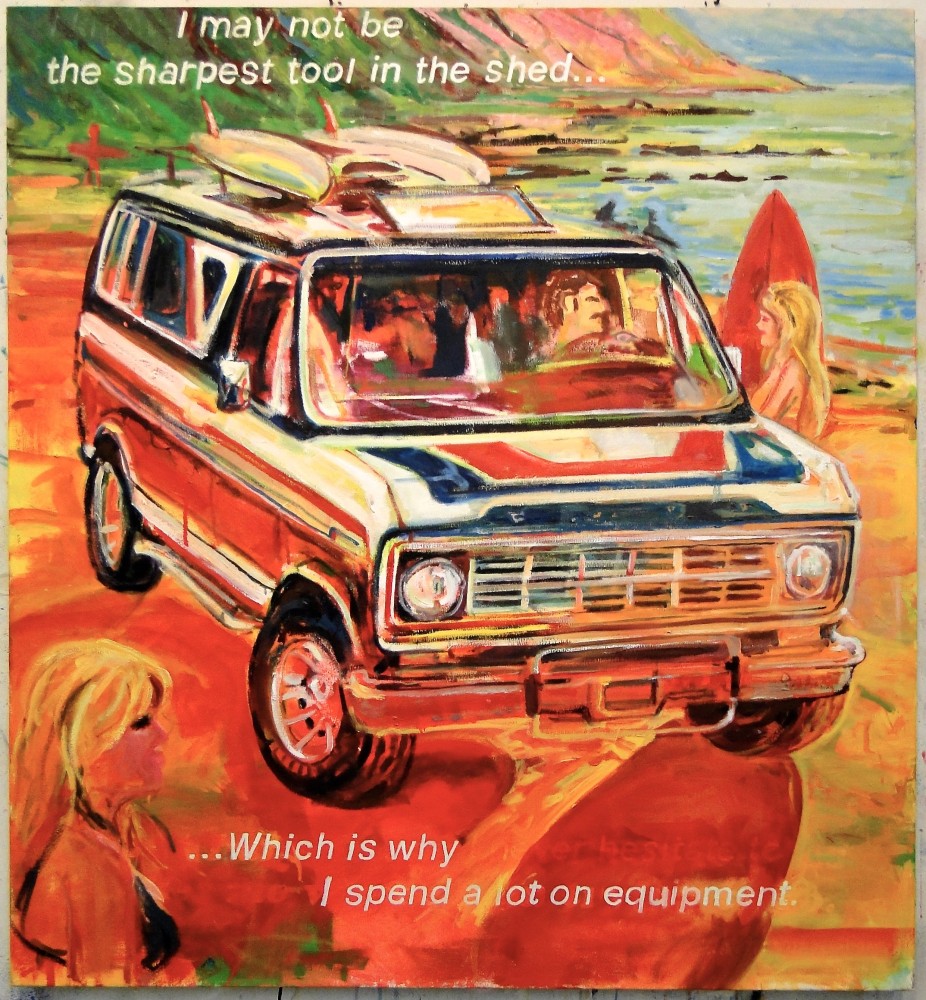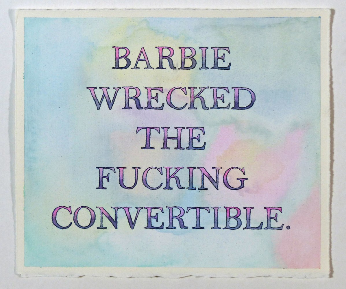 Other artists emphasize the slippery character of language, visible in the sly humor that underscores Alex Gingrow’s and David Kramer’s work. In Barbie Wrecked the Fucking Convertible and I Used to Shave My Legs, Gingrow superimposes short, clipped proclamations over faint backgrounds, uncomplicating the words’ deadpan directness. Juxtaposing pop-culture cues with glimpses into private dramas, the works call attention to the simultaneous division and overlap of the personal and mass culture, and exalt the seemingly inconsequential sparks and friction of interpersonal dynamics. David Kramer evokes the mythos of surfer and beach culture in Beach Van, pairing their essential signifiers with text reminiscent of advertising copy. Interweaving consumerism and sexual desire (along with suggestive, innuendo-laden text), Beach Van presents sexuality as leisure, a diversion from the “real world” and source of pleasure like any other product or subcultural trend.