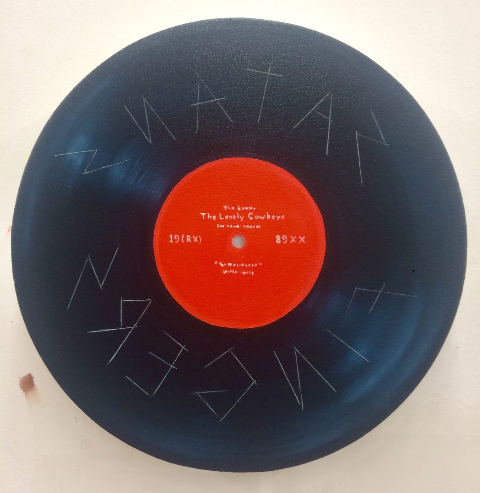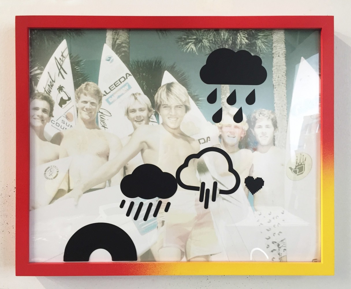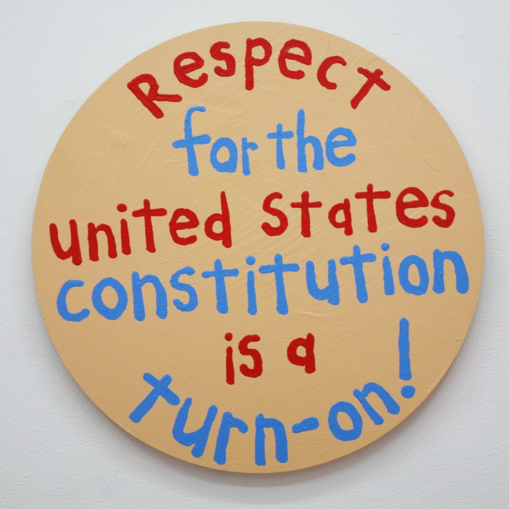 Other artists emphasize the slippery character of language, visible in the sly humor that underscores Alex Gingrow’s and David Kramer’s work. In Barbie Wrecked the Fucking Convertible and I Used to Shave My Legs, Gingrow superimposes short, clipped proclamations over faint backgrounds, uncomplicating the words’ deadpan directness. Juxtaposing pop-culture cues with glimpses into private dramas, the works call attention to the simultaneous division and overlap of the personal and mass culture, and exalt the seemingly inconsequential sparks and friction of interpersonal dynamics. David Kramer evokes the mythos of surfer and beach culture in Beach Van, pairing their essential signifiers with text reminiscent of advertising copy. Interweaving consumerism and sexual desire (along with suggestive, innuendo-laden text), Beach Van presents sexuality as leisure, a diversion from the “real world” and source of pleasure like any other product or subcultural trend.