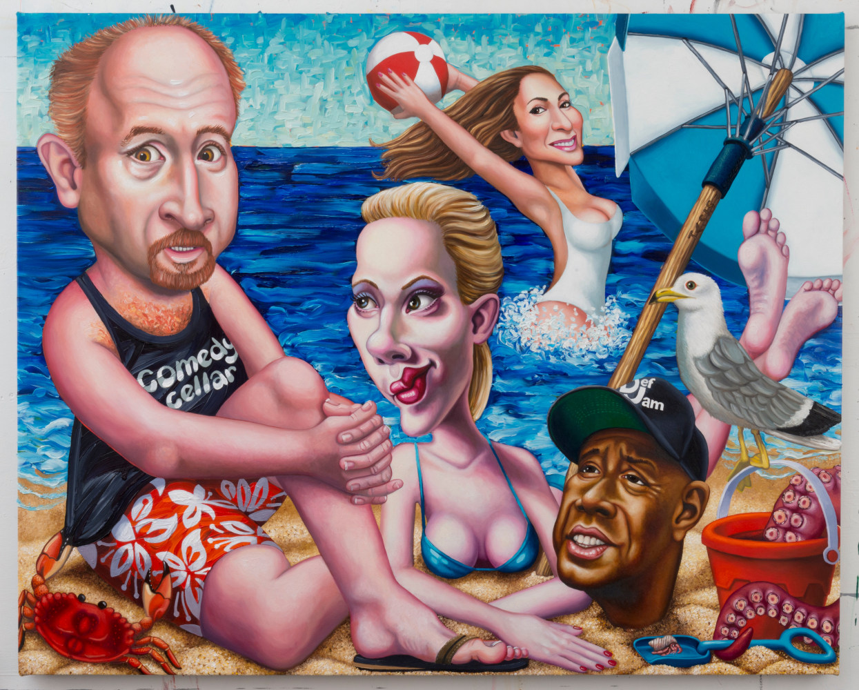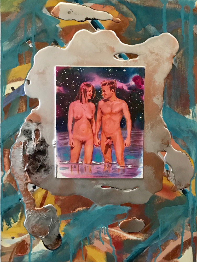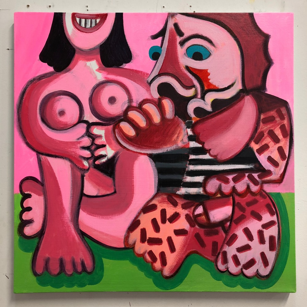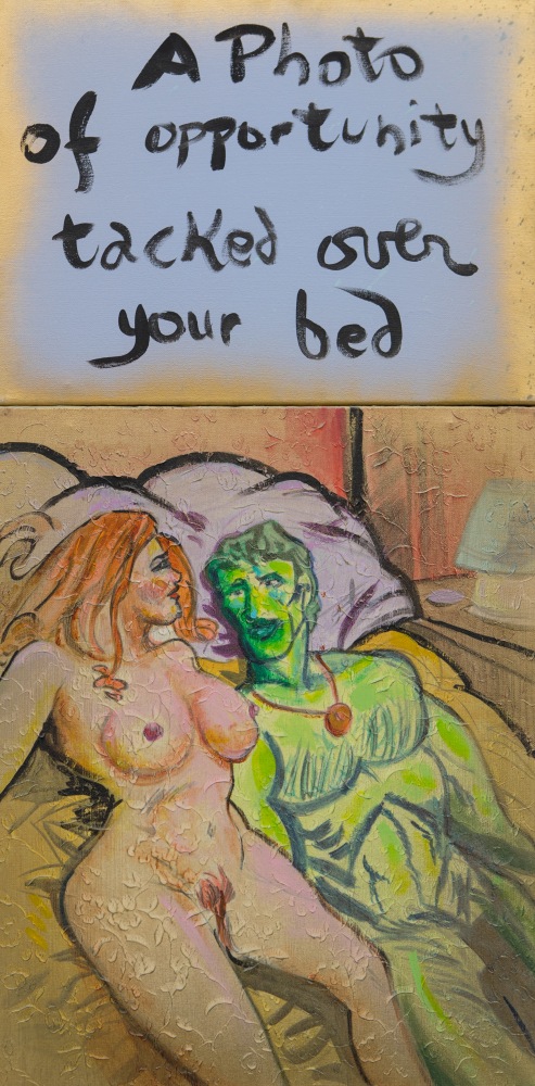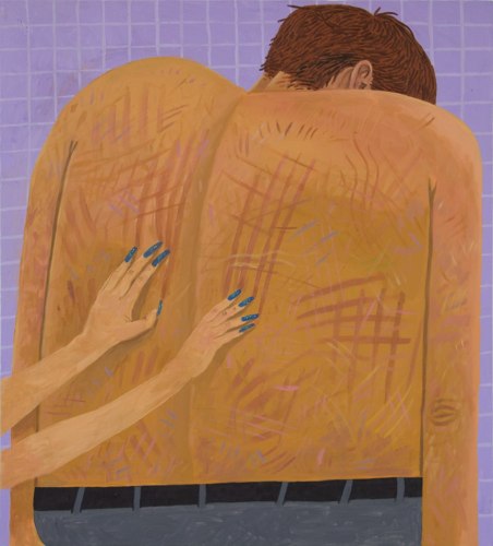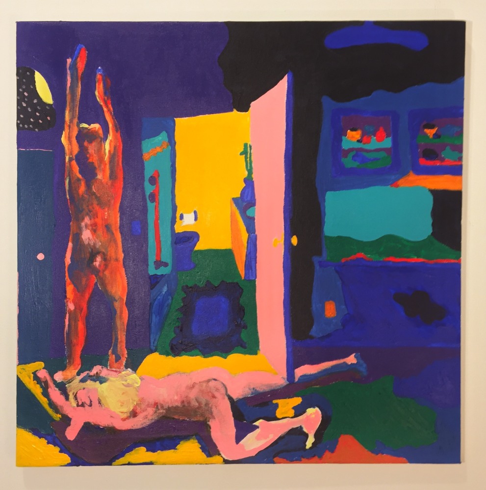 In a darker, more narrative vein, the legendary Louise Bourgeois presents two giant, red vampirish breasts, at once either dominating or being suckled for blood, rather than milk, by a prone male figure: a variation of vagina dentata, depicting the more morbid side of co-dependent relationships. Likewise for David Humphrey’s surreal rendering of a young couple engaging in a naked standing “quickie”, perhaps between classes or outside the high school prom. A sense of secrecy and shallow desperation permeates the scene: casual sex on the sly. The sexual decadence and excess of Lauren Nickou’s paintings of orgies reflect similar deviant tendencies, though they are somewhat obfuscated by fleeting glimpses of tenderness. Tom Sanford's bucolic 2015 beach painting of Louis C.K., Scarlett Johansson, Russell Simmons and Jennifer Lopez, based loosely on a Picasso composition, has a radically altered meaning in light of recent events, allegations, admissions and crimes.