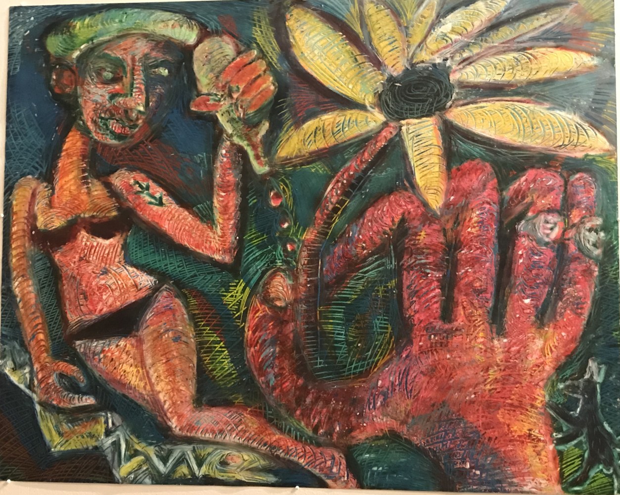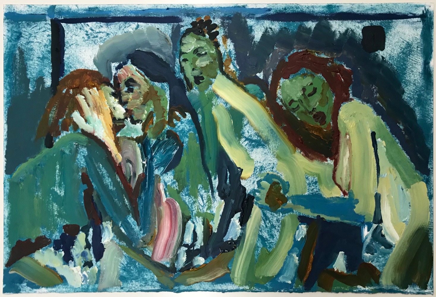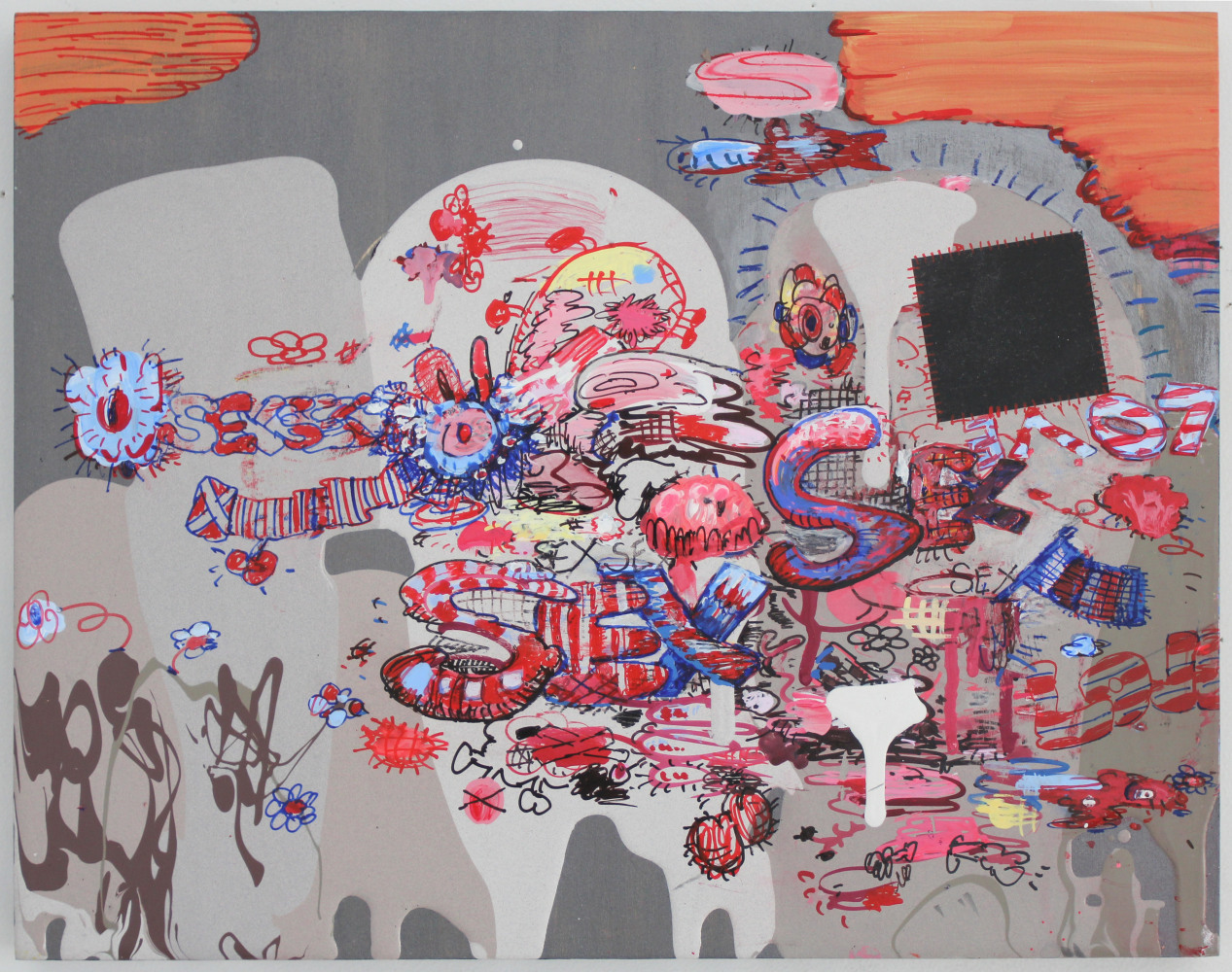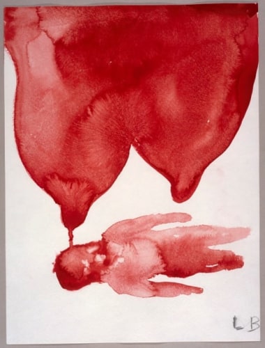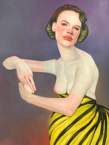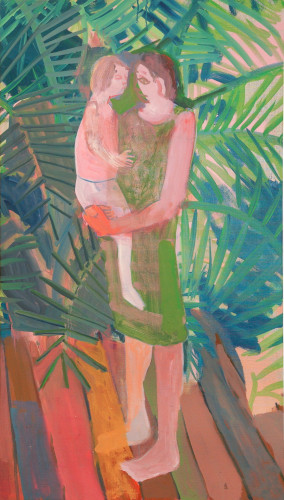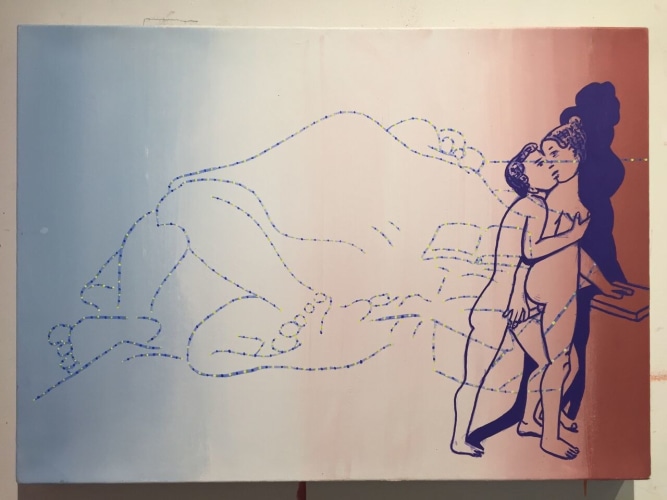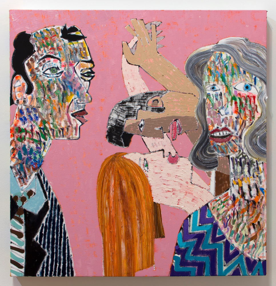 In a darker, more narrative vein, the legendary Louise Bourgeois presents two giant, red vampirish breasts, at once either dominating or being suckled for blood, rather than milk, by a prone male figure: a variation of vagina dentata, depicting the more morbid side of co-dependent relationships. Likewise for David Humphrey’s surreal rendering of a young couple engaging in a naked standing “quickie”, perhaps between classes or outside the high school prom. A sense of secrecy and shallow desperation permeates the scene: casual sex on the sly. The sexual decadence and excess of Lauren Nickou’s paintings of orgies reflect similar deviant tendencies, though they are somewhat obfuscated by fleeting glimpses of tenderness. Tom Sanford's bucolic 2015 beach painting of Louis C.K., Scarlett Johansson, Russell Simmons and Jennifer Lopez, based loosely on a Picasso composition, has a radically altered meaning in light of recent events, allegations, admissions and crimes.