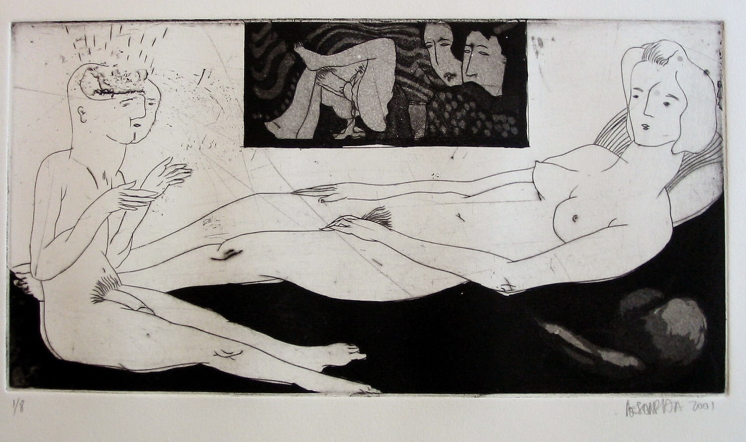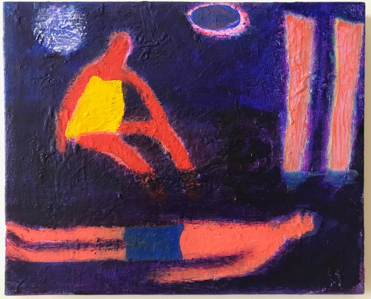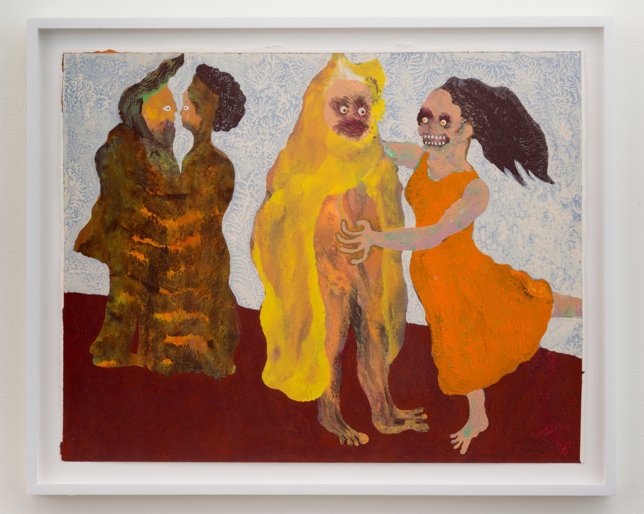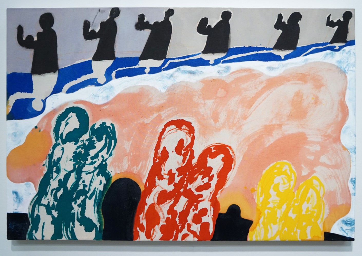 In a darker, more narrative vein, the legendary Louise Bourgeois presents two giant, red vampirish breasts, at once either dominating or being suckled for blood, rather than milk, by a prone male figure: a variation of vagina dentata, depicting the more morbid side of co-dependent relationships. Likewise for David Humphrey’s surreal rendering of a young couple engaging in a naked standing “quickie”, perhaps between classes or outside the high school prom. A sense of secrecy and shallow desperation permeates the scene: casual sex on the sly. The sexual decadence and excess of Lauren Nickou’s paintings of orgies reflect similar deviant tendencies, though they are somewhat obfuscated by fleeting glimpses of tenderness. Tom Sanford's bucolic 2015 beach painting of Louis C.K., Scarlett Johansson, Russell Simmons and Jennifer Lopez, based loosely on a Picasso composition, has a radically altered meaning in light of recent events, allegations, admissions and crimes.