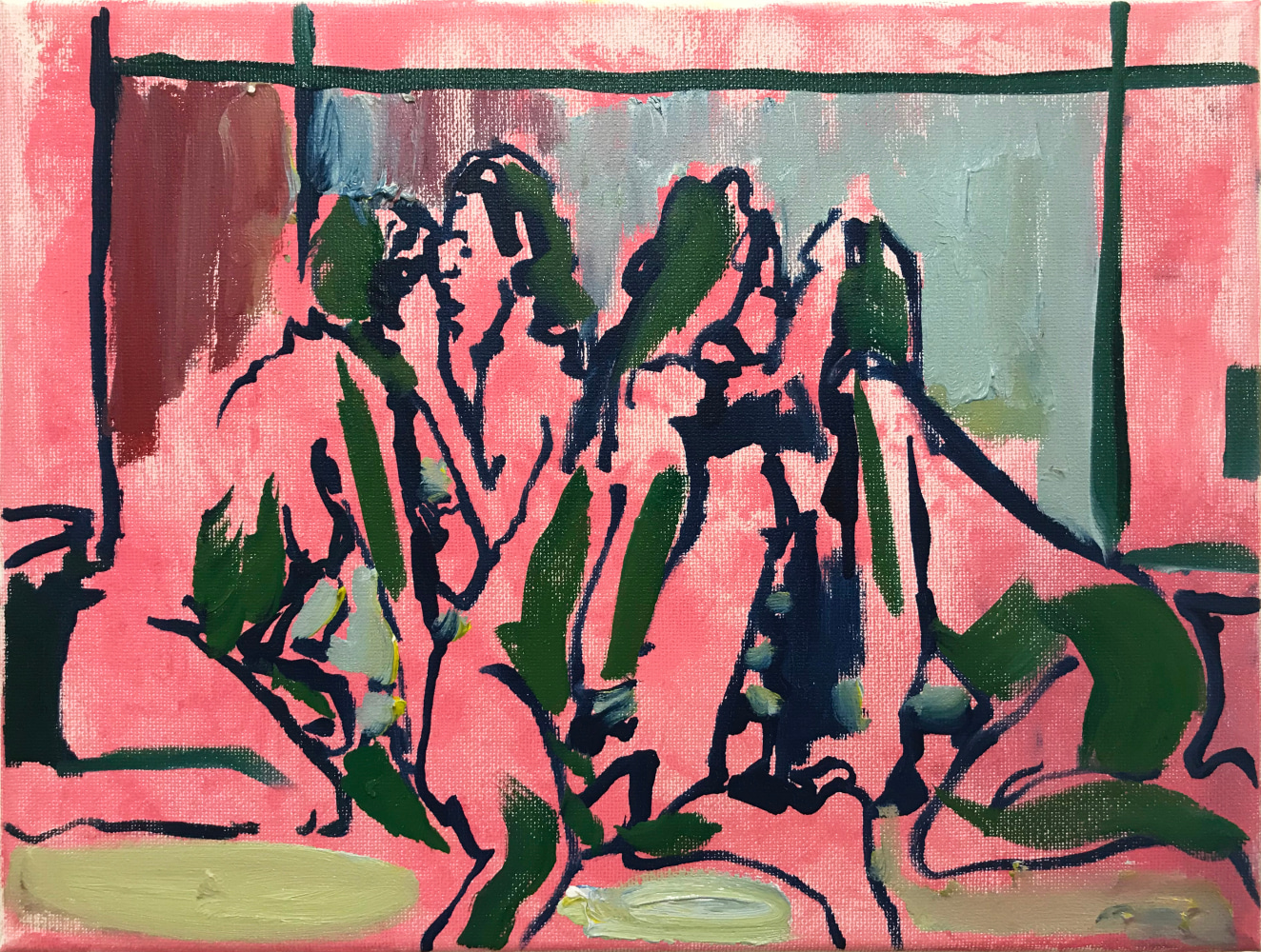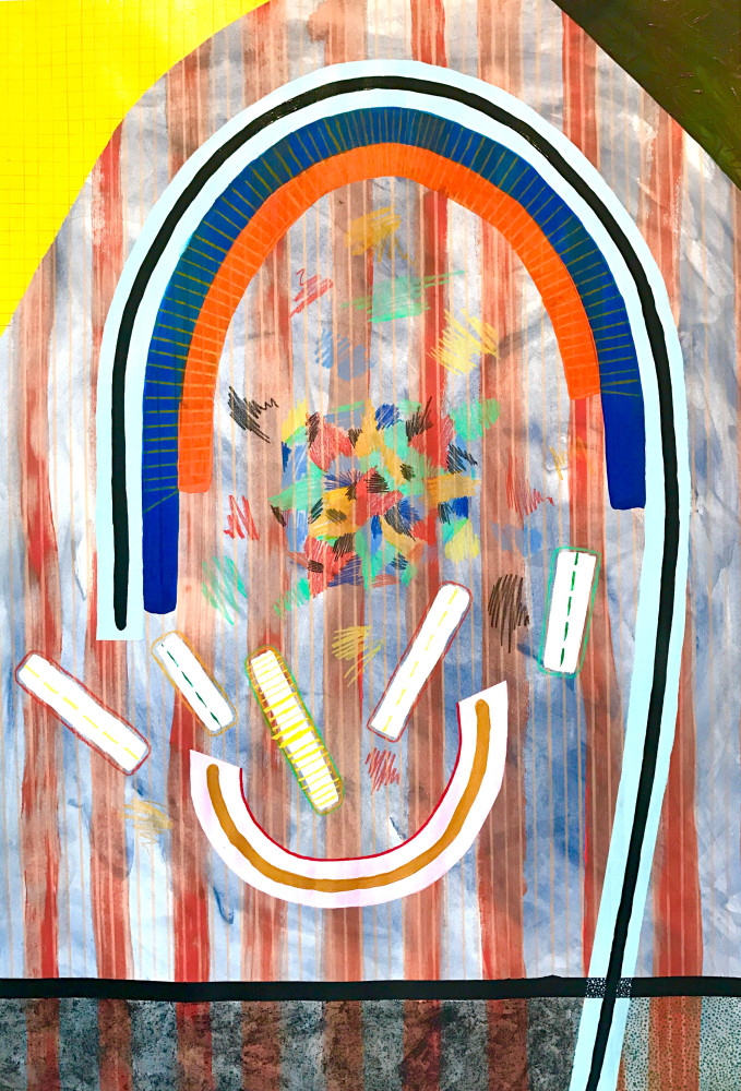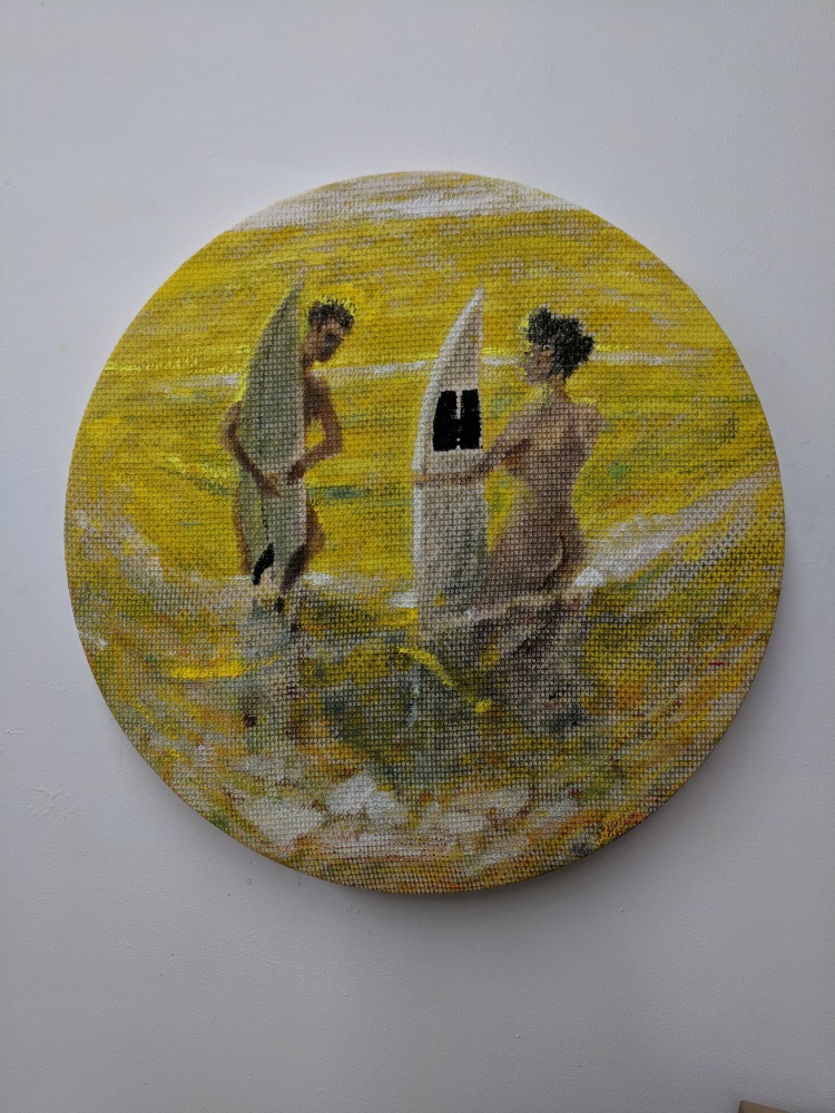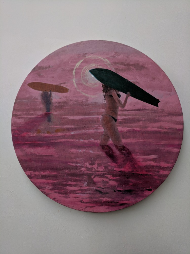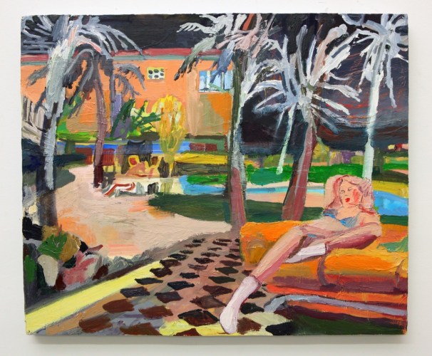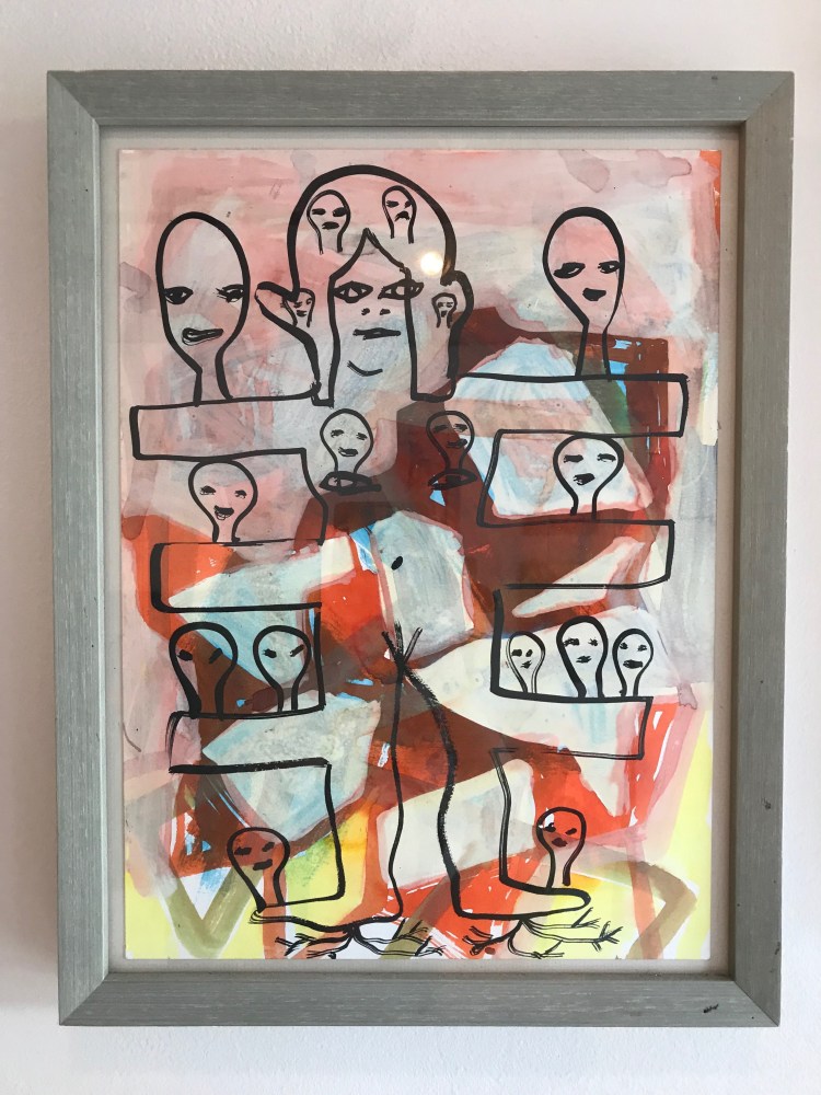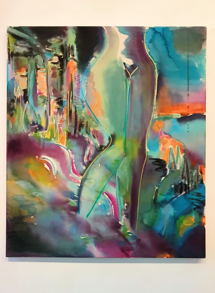 Another painting, small but replete with social commentary is Early Childhood Development Center by Jules de Balincourt. Unlike his usual sweeping Utopic scenes of millenials gathered at Burning Man, Coachella, or Carribbean surf settings which we might expect for this show, this tiny vista is tight, repressed, and vaguely ominous. A sense of isolation, melancholy, and dread fills the frame. Love has been replaced by loss, as well as a kind of bitter irony. Elizabeth Huey’s environments manifest quite a different set of qualities; open ended, unpredictable, and charged with dynamism and possibility, they are spaces where individuals are free to explore mental states beyond conformity and social norms.