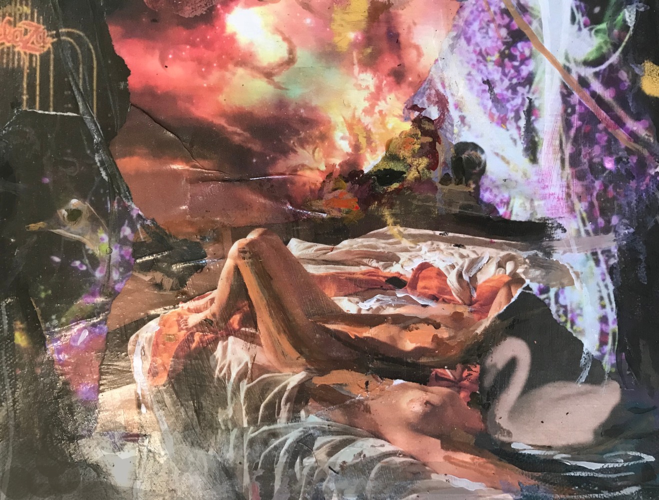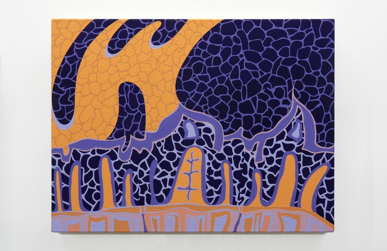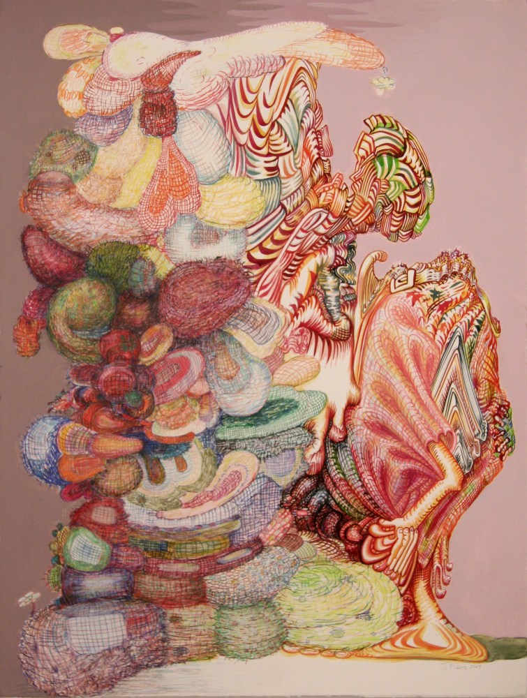 The biomorphic imagery of Aime Cunat’s Calistoga channels correspondences between the architecture of Calistoga, CA, and organic forms, synthesizing the two in a surreal paradise that questions the solidity of reality. Like Coates, Cunat’s use of modern and iridescent pigments further complicates the balance of the organic and inorganic in her work, and reveals ways in which technological and chemical advances can enhance our perception of nature.