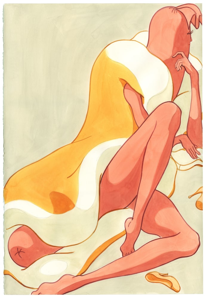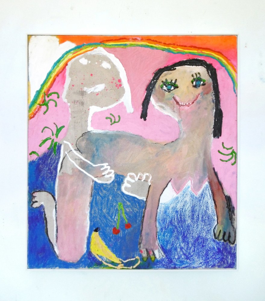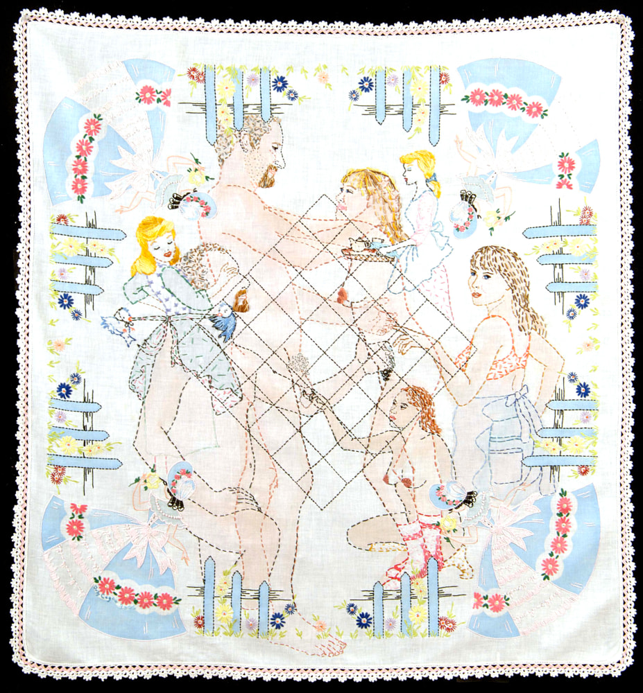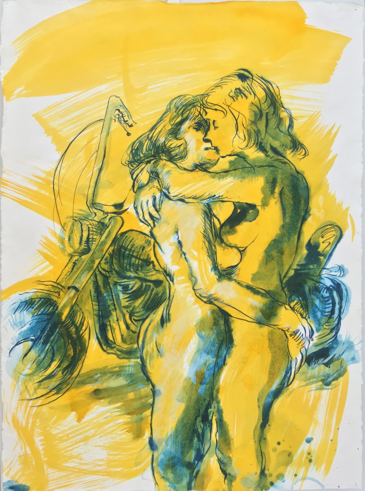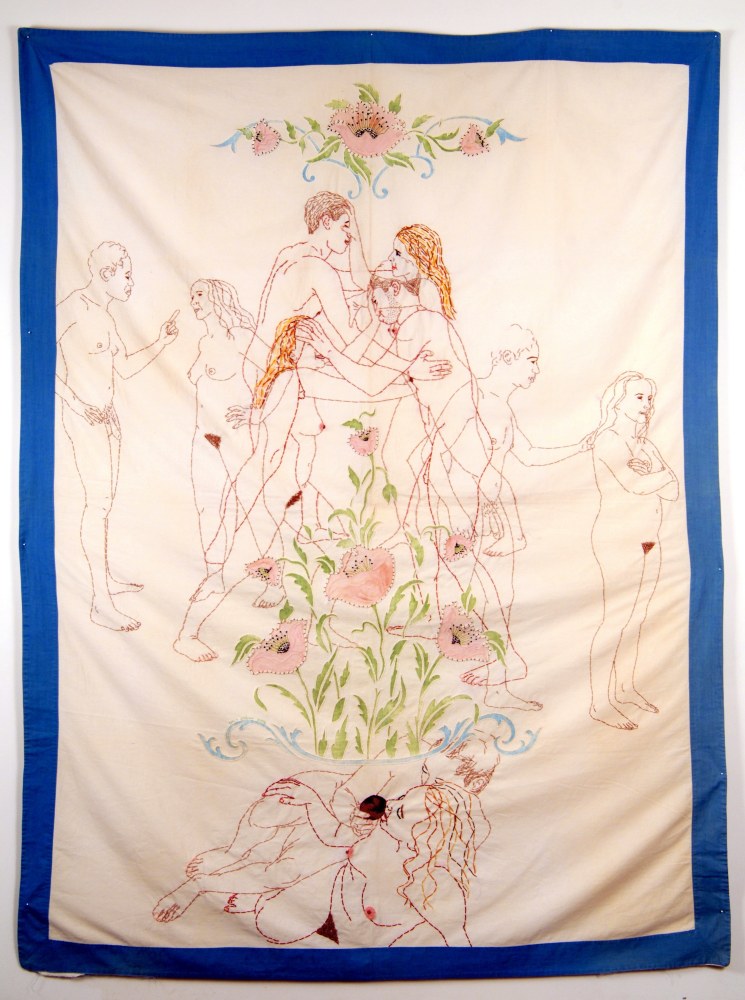 Philip Pearlstein’s typically visceral, pastel 70s era nudes are a welcome contribution to Summer of Love. His portrayal of a melancholy, serious couple sitting in repose in lawn chairs, possibly before or after sex, fills the viewer with the ennui often accompanying carnal love. In a similar vein, Jenna Gribbon paints a nude woman smoking a cigarette from the perspective of her lover, though their entangled limbs imply intimacy and connection rather than alienation. Bendix Harms’ playful and funny, mythologically attuned drawings of heart-shaped birds and enrapt lovers celebrate love and innocence. Orly Cogan offers delicate and beautiful subversive embroidered stories that depict relationships that combine fairy tale with contemporary power struggles.