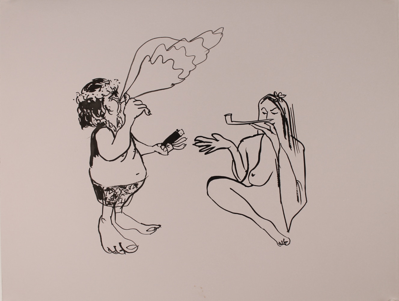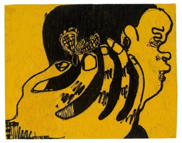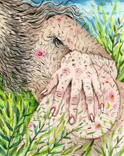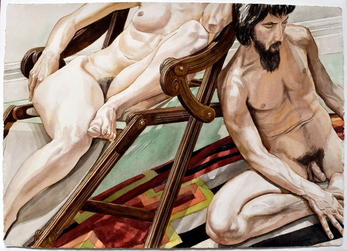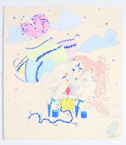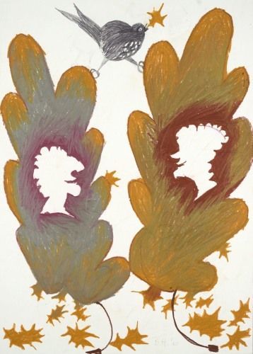 Philip Pearlstein’s typically visceral, pastel 70s era nudes are a welcome contribution to Summer of Love. His portrayal of a melancholy, serious couple sitting in repose in lawn chairs, possibly before or after sex, fills the viewer with the ennui often accompanying carnal love. In a similar vein, Jenna Gribbon paints a nude woman smoking a cigarette from the perspective of her lover, though their entangled limbs imply intimacy and connection rather than alienation. Bendix Harms’ playful and funny, mythologically attuned drawings of heart-shaped birds and enrapt lovers celebrate love and innocence. Orly Cogan offers delicate and beautiful subversive embroidered stories that depict relationships that combine fairy tale with contemporary power struggles.