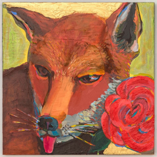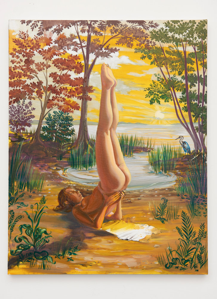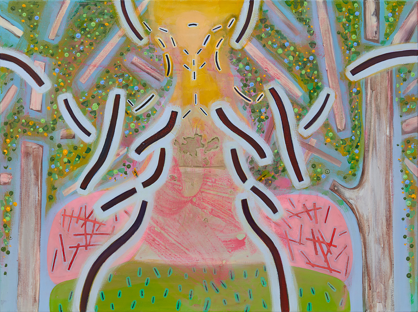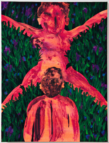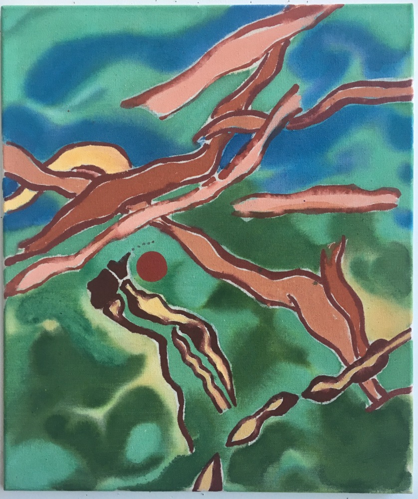 Heavily informed by early Modernist painters such as Matisse, Kandinsky, and Klee (particularly their integration of the teachings of mystic writers), Coates’ work offers a visionary take on the natural world, investigating its resonances with perception and the human experience. In Visitation, trees and branches are stylized into kaleidoscopic motifs, which, paired with an otherworldly palette, convey the sense of a transcendental phenomenon. Ryan Schneider’s work conflates human, animal, and abstract signifiers, connoting a psychedelic experience wherein the natural world exerts a profound psychological impact.