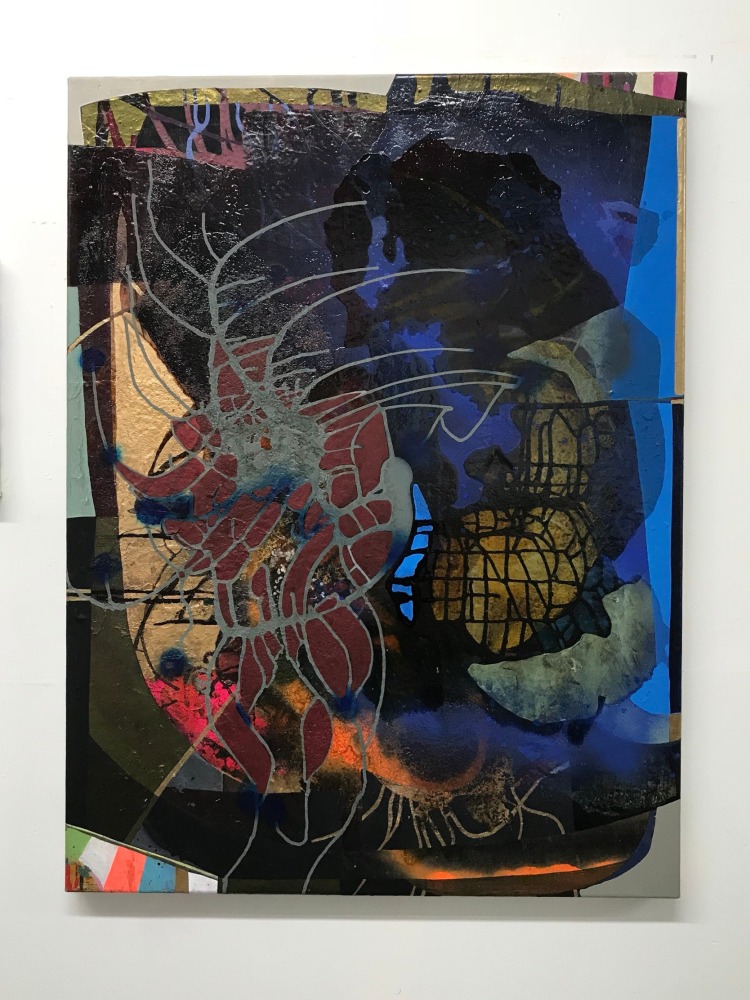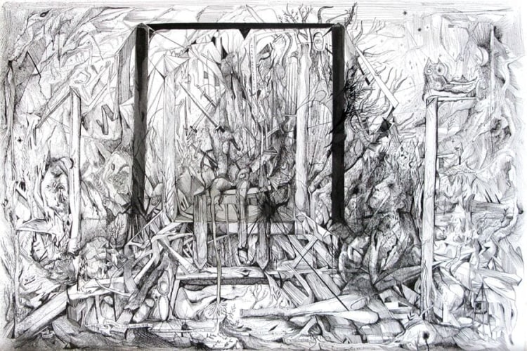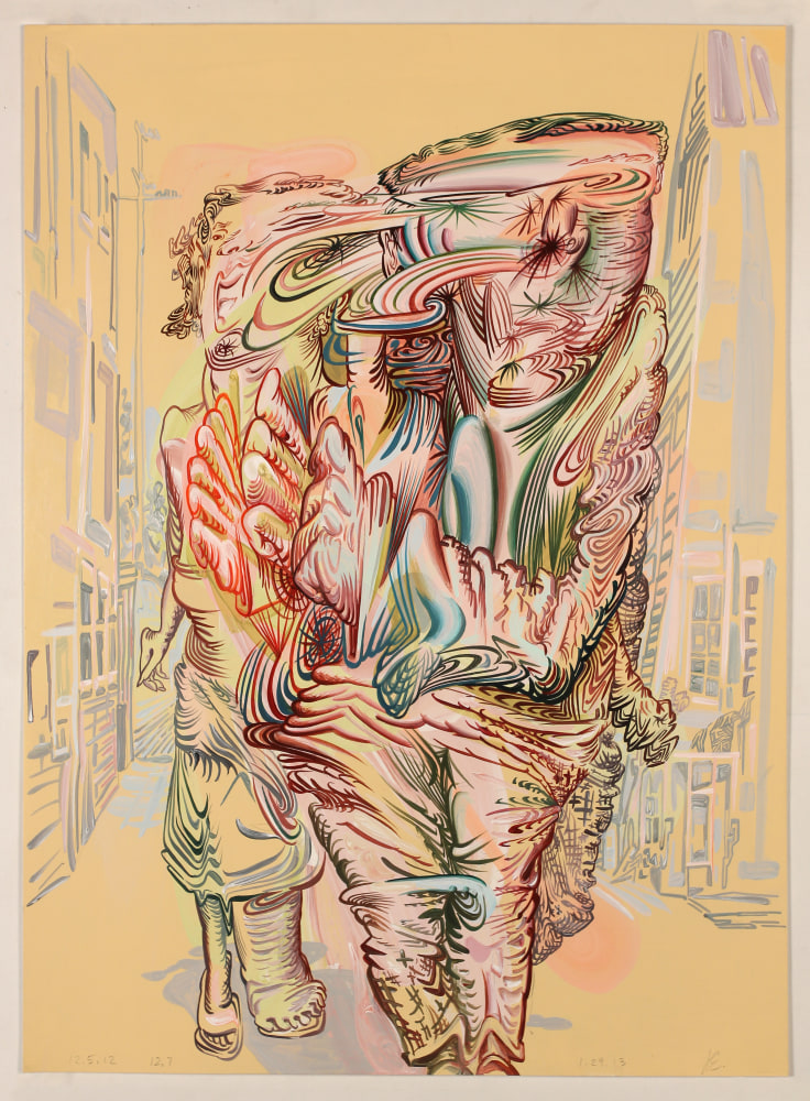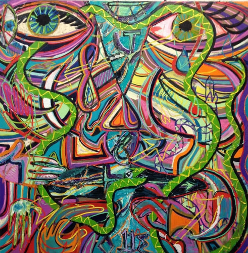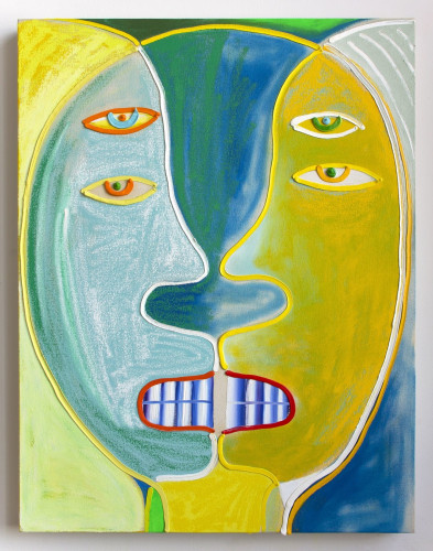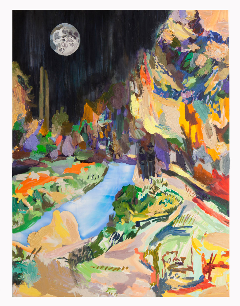 Heavily informed by early Modernist painters such as Matisse, Kandinsky, and Klee (particularly their integration of the teachings of mystic writers), Coates’ work offers a visionary take on the natural world, investigating its resonances with perception and the human experience. In Visitation, trees and branches are stylized into kaleidoscopic motifs, which, paired with an otherworldly palette, convey the sense of a transcendental phenomenon. Ryan Schneider’s work conflates human, animal, and abstract signifiers, connoting a psychedelic experience wherein the natural world exerts a profound psychological impact.