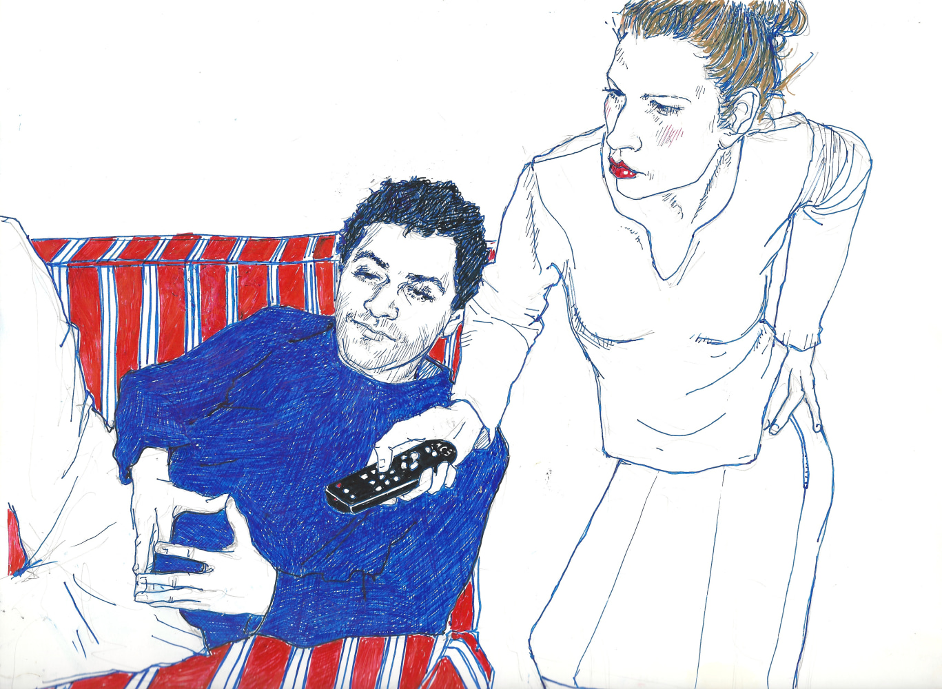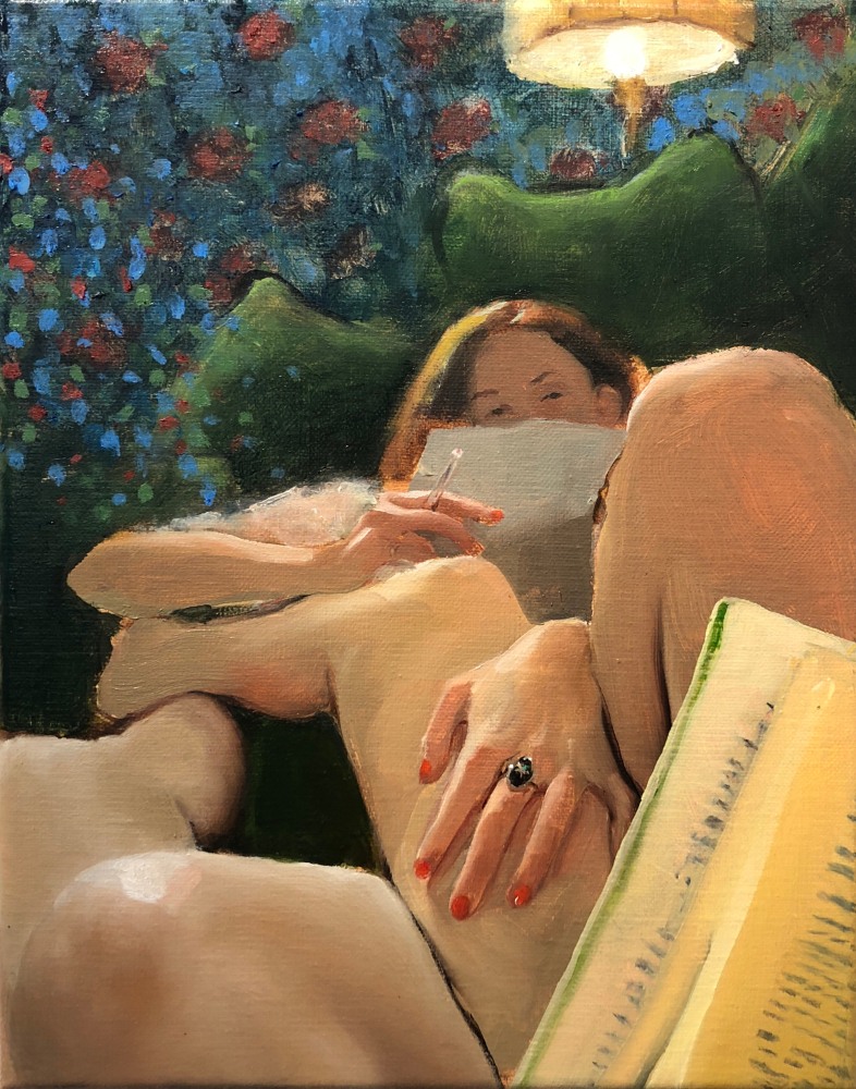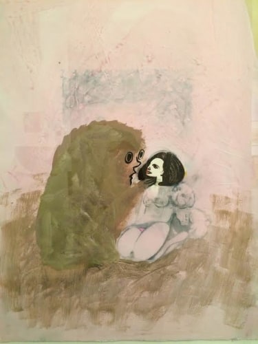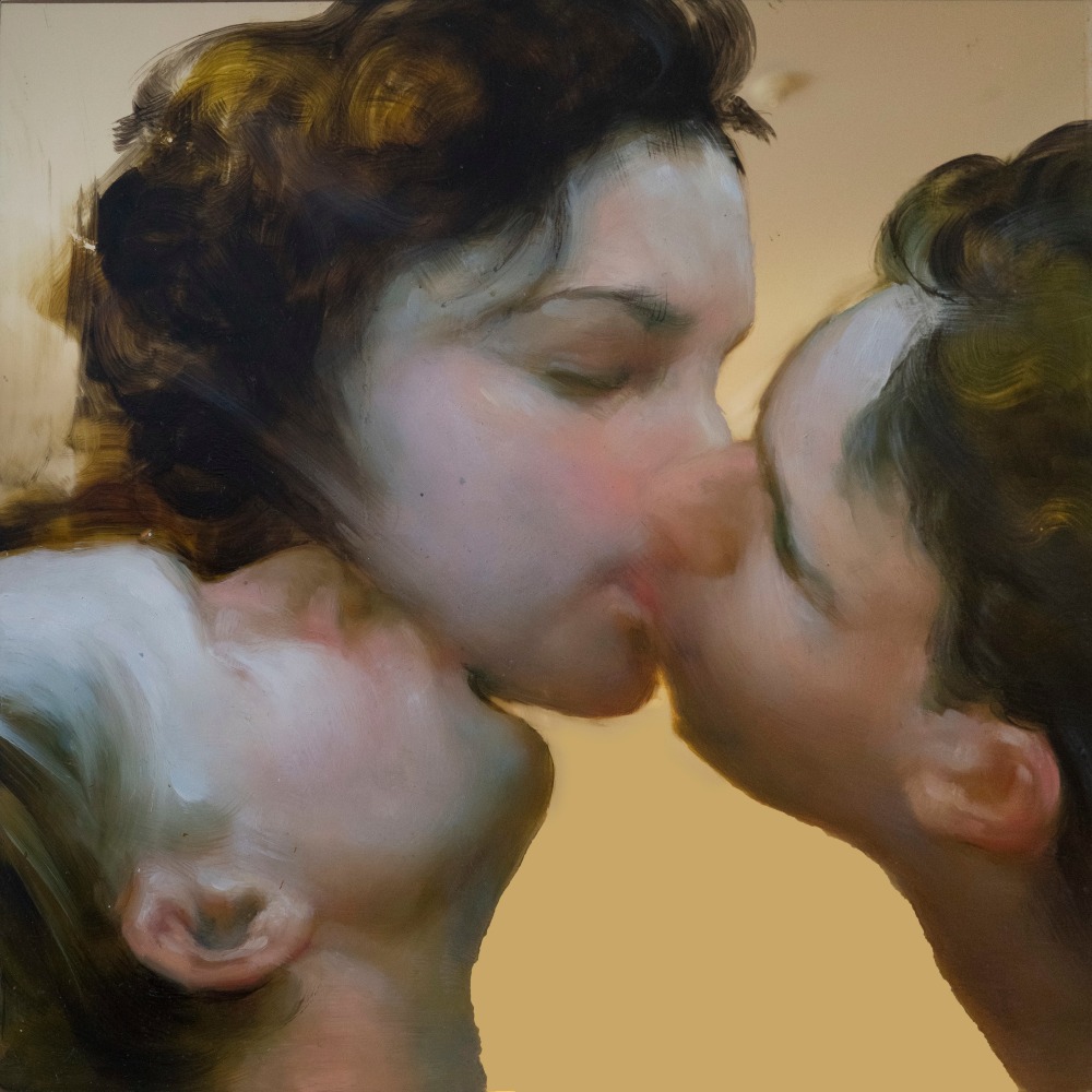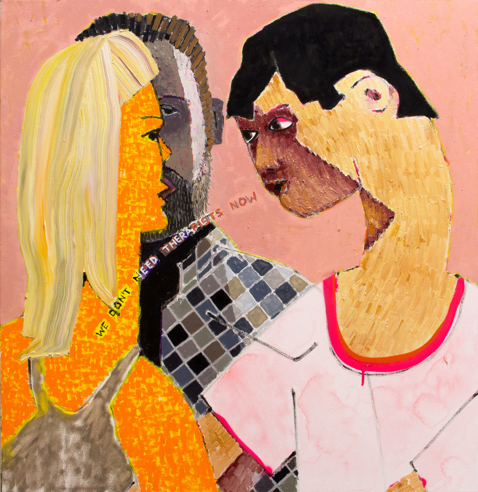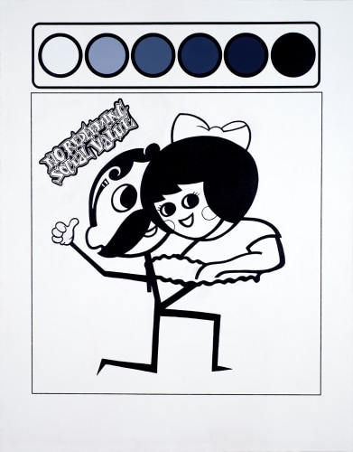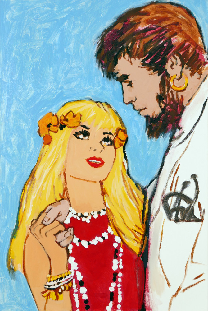 With its similar exaggeration of 60’s cultural tropes, Walter Robinson’s Love Doctor also seems to descend from some pop culture ID. The artist has long used source materials such as magazine advertisements and the cover illustrations of romance novels, and drawing from the latter, “Love Doctor” channels a dramatic, storybook vision of love. Shifting between emotional intensity and a sort of parody of the format, Robinson complicates the viewer’s reading of the image and its connotations. Hope Gangloff and Aaron Johnson veer into the domestic realm, depicting the daily ups-and-downs of relationships and cohabitation. Gangloff’s Untitled is a highly relatable image of a couple watching television, and in its portrayal of shared simple pleasures, reminds us of the solace and pure comfort of love.