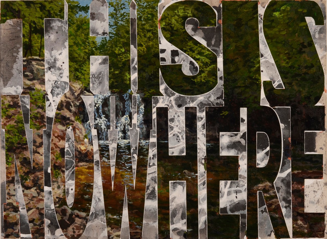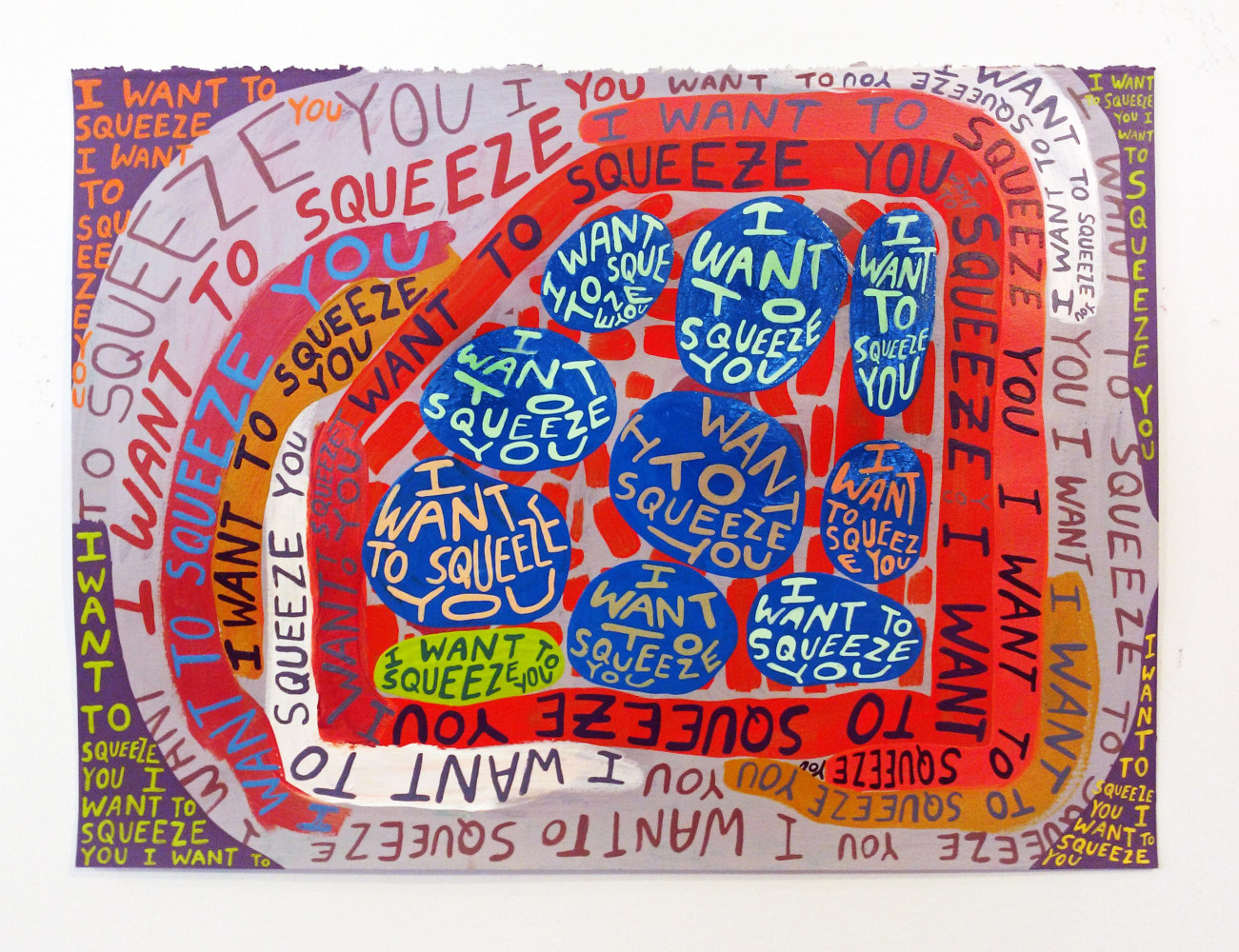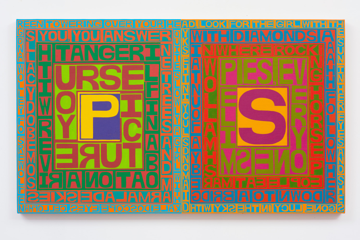 In Lucy in the Sky with Diamonds #3 (Stereo Mix), Erik den Breejen forges a direct link with the counterculture and hippy movements of the 1960’s, transmuting the lyrics of the iconic Beatles song into a richly hued, textual mosaic. Amidst gracefully modulating color harmonies and variations in scale, the words take on a hypnotic, mantra-like quality, projecting a sense of catharsis and tranquility grounded in the lyrics’ utopian imagery. Becky Brown zeros in on the power of repetition in I want to squeeze you, amplifying the urgency and intention of the namesake phrase with each recapitulation, resulting in a monad-like singularity of meaning within the composition that parallels the often overwhelming nature of desire. In contrast, Samuel Jablon’s Love hinges on the rarefied expressive potential of a single word (referencing Robert Indiana’s seminal LOVE sculpture with a reverse E), creating a mirror of sorts for the viewer to confront their own understanding of love.