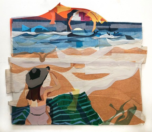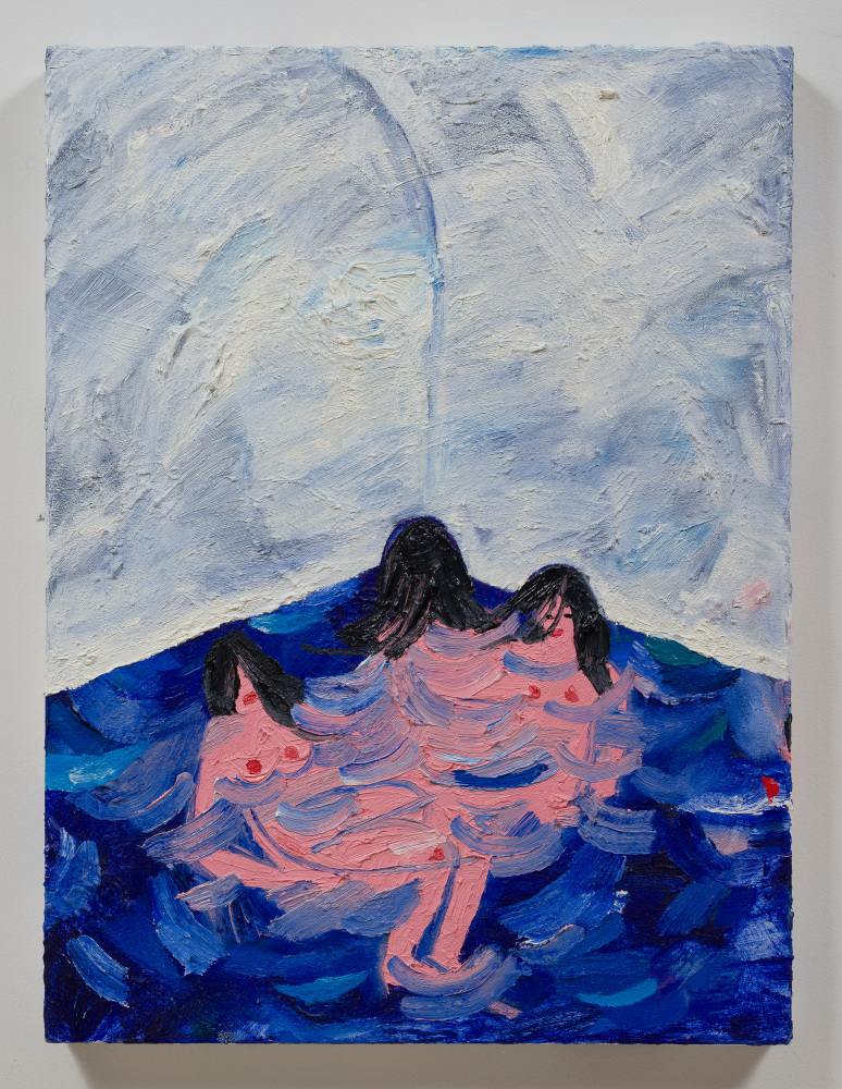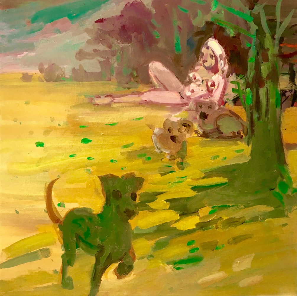 Atmospheric environments and landscape imagery are central in a variety of other works in the exhibition, such as the luminous paintings of Katherine Bradford, Deborah Brown, Jennifer Coates and JJ Manford. In Summer Fun at F+V, Bradford’s figures seem to hover in an area suggestive of both water and endless space, their simplified forms blending with their surroundings in a physical analogy of the dissolution of ego native to love and deep human connection. As with many of the works in Summer of Love, Bradford evades linear meaning, instead inviting the viewer to interpret her forms in light of their own perspective and experience. In Green Dogs, Deborah Brown’s sprightly description of human and animal forms insinuates their internal energy, evoking a feeling of harmony and rhythm that links the reclining female figure with the dogs and landscape elements.